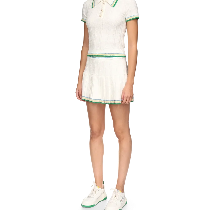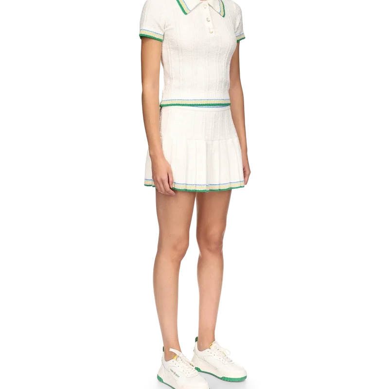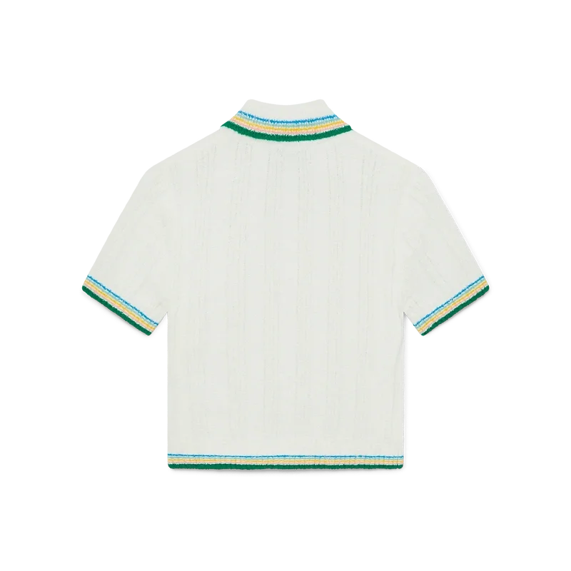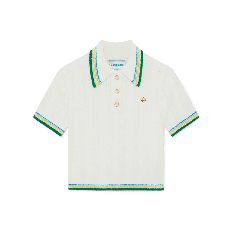 Rib Boucle-pikétröjan har en mjuk ribbad struktur och är försedd med märkets guldpläterade, sammanlänkade CC-logotypnitar på bröstet. Tillverkad av ett ribbat stickat tyg i bomullsblandning och avslutad med signaturknappar med guldkant och pärlemor samt randiga detaljer på kragen, manschetterna och fållen.