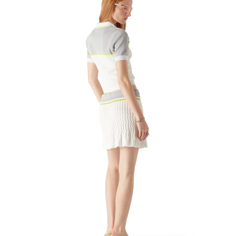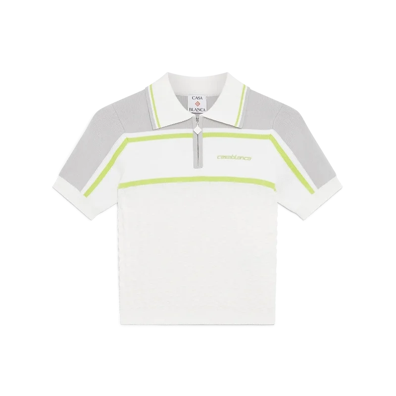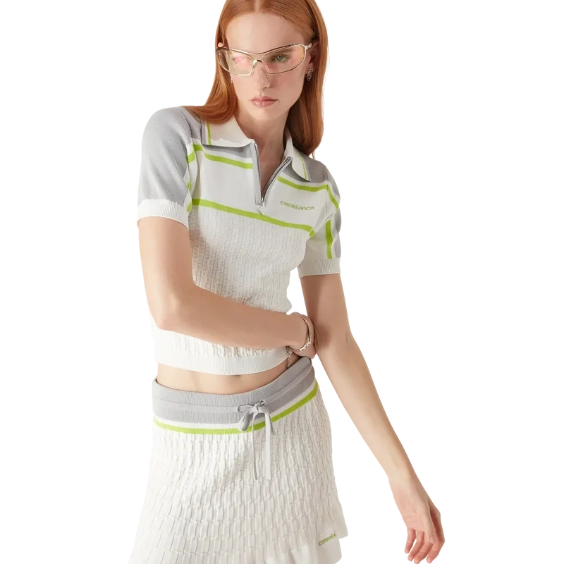 Tennispolotröjan är en stickad modell med kontrasterande axlar och ärmslut. Den har dragkedja, krage med randiga kanter, Casablancas signaturlogo samt ribbade manschetter och nederkant.