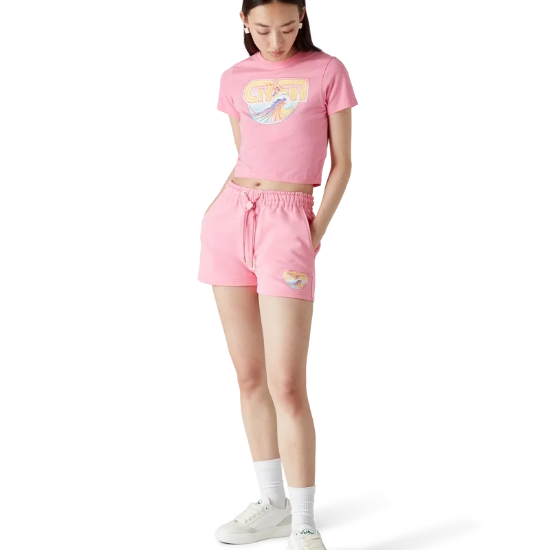 Casa Surf-sweatshorts är ett tryckt plagg tillverkat av ekologisk bomull med ett signaturmönster inspirerat av vintage-surfbrädor från 70-talet som bleknat i solen. Kompletteras med en elastisk midjeresår, dragsko, en Cc-logotypknapp, snedställda framfickor och en påsydd bakficka.