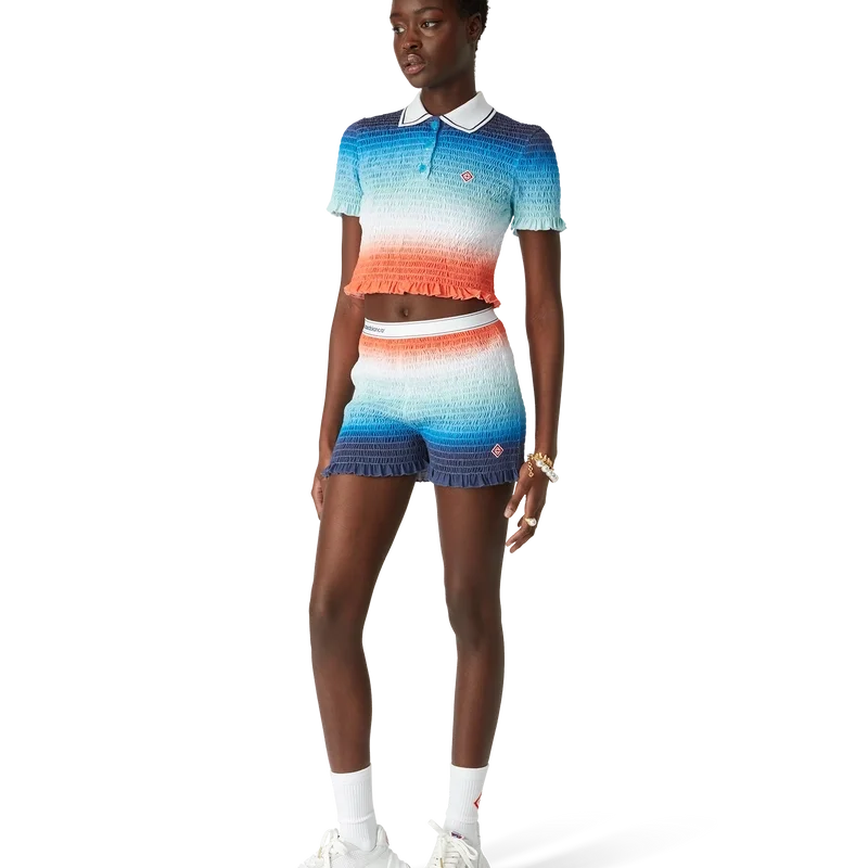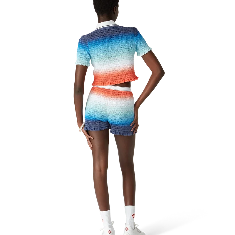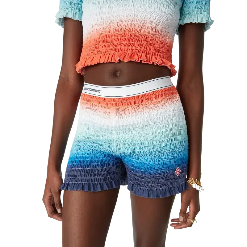 Gradient Shirred Shorts är ett par shorts med heltryck som pryds av märkets signaturdiamantlogo. Kompletterade med ett elastiskt midjeband med Casablanca-logotyp och kantdetaljer samt volangdetaljer i nederkanten.