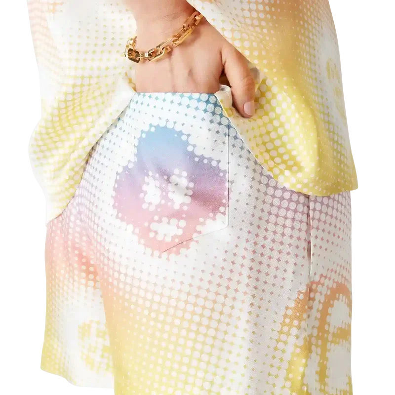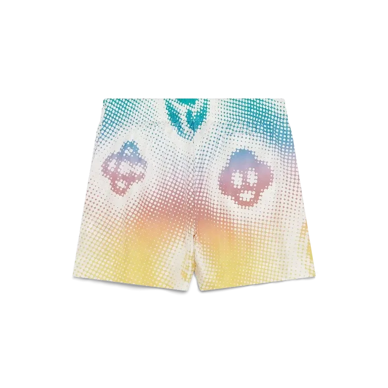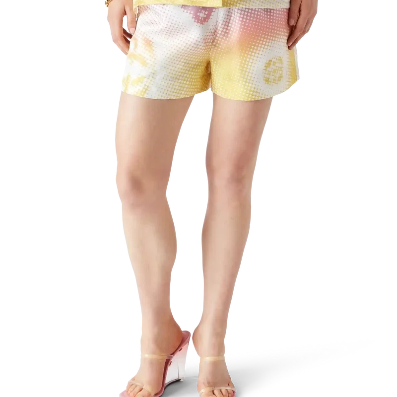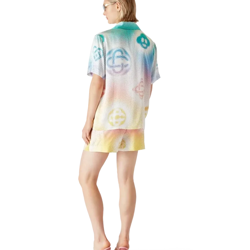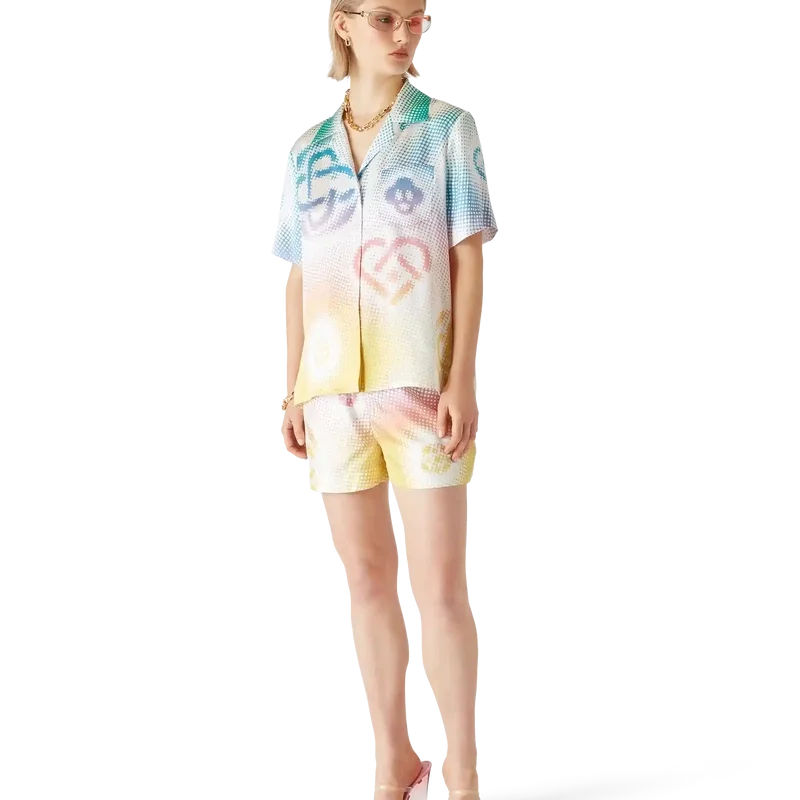Halftone Logo Silk Shorts har ett heltäckande tryck med husets monogram i airbrush-teknik, som bygger vidare på våra tidigare experiment med tekniken. Kompletteras med elastisk midja, en påsydd bakficka och sidofickor i sömmarna.