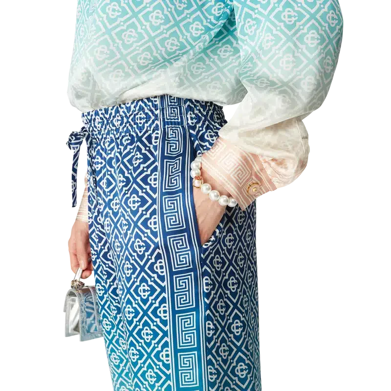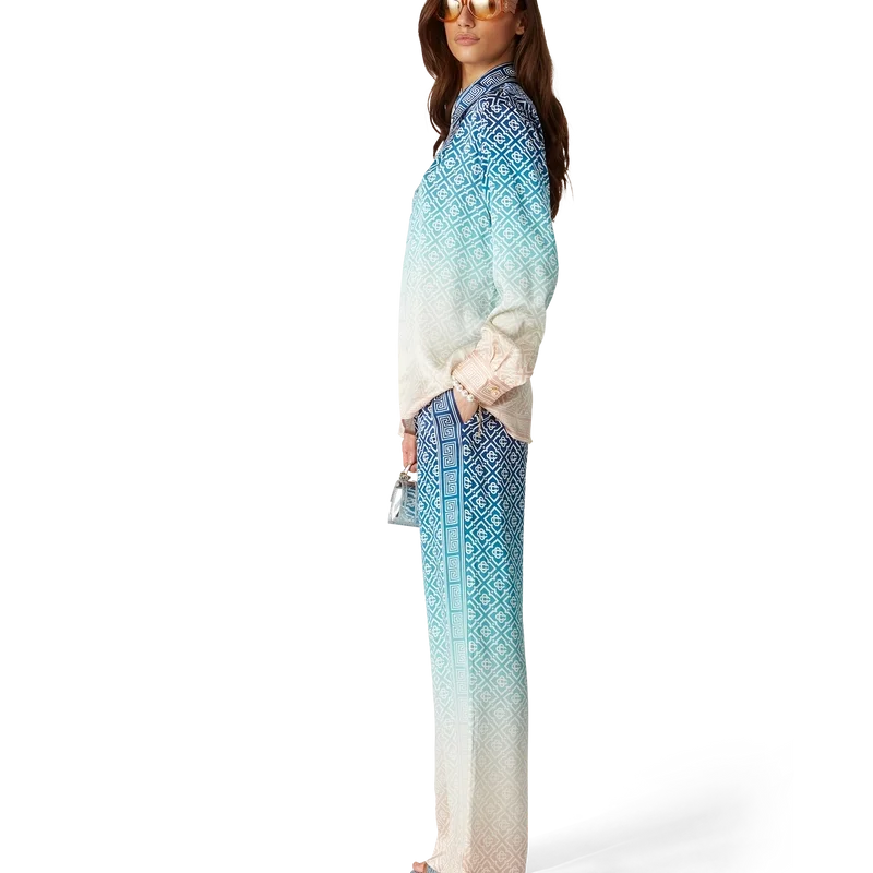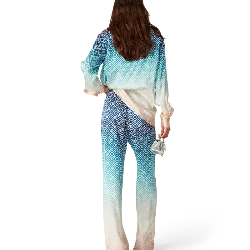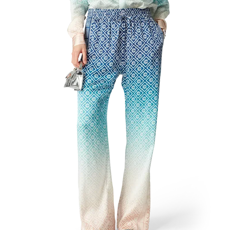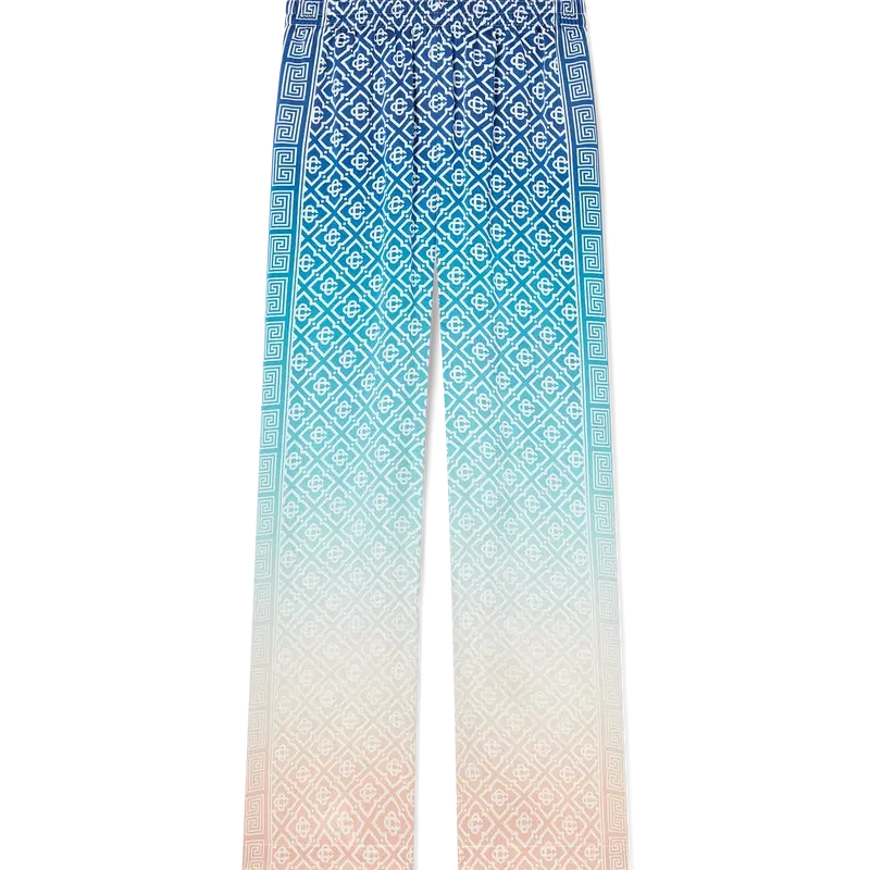 Jacquard-byxorna i silke med gradient är heltäckande tryckta med husets signaturmonogram och tillverkade av silkesatintyg. De har en elastisk midjeresår, fickor i sidosömmarna och foder.