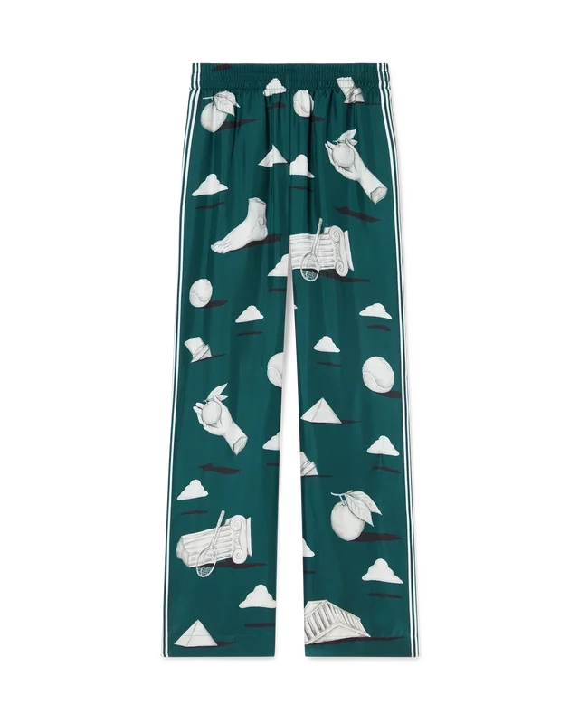 Metaphysical Silk Byxor är ett heltäckande tryckt mönster tillverkat av silketwilltyg, med konstverk som avbildar husets centrala designelement. Kompletteras med en elastisk midjeresår med dragsko, sidofickor i sömmarna och randiga detaljer längs sidorna.