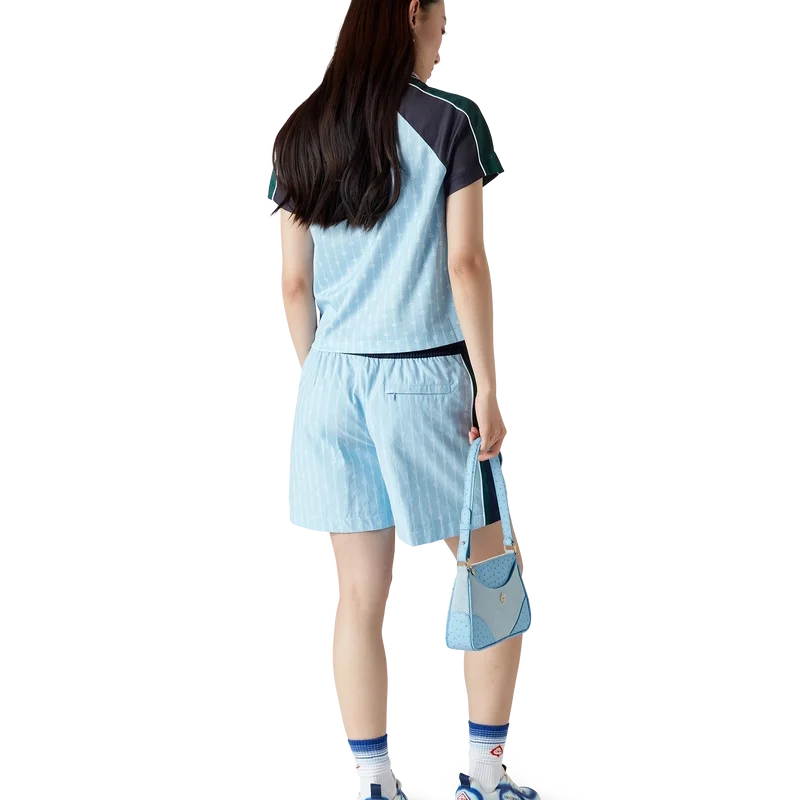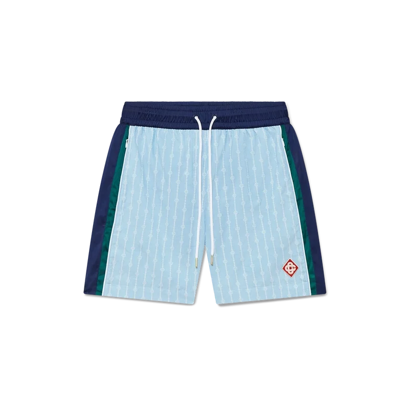 De randiga träningsshortsen är ett sportplagg tillverkat av bomullstyg med husets sammanflätade CC-logotyp. De kompletteras med en signaturdiamantlogotyp, en elastisk midjeresår, dragsko med guldspetsar, sidofickor med dragkedja i sömmen, randiga detaljer längs sidorna och en bakficka med dragkedja.