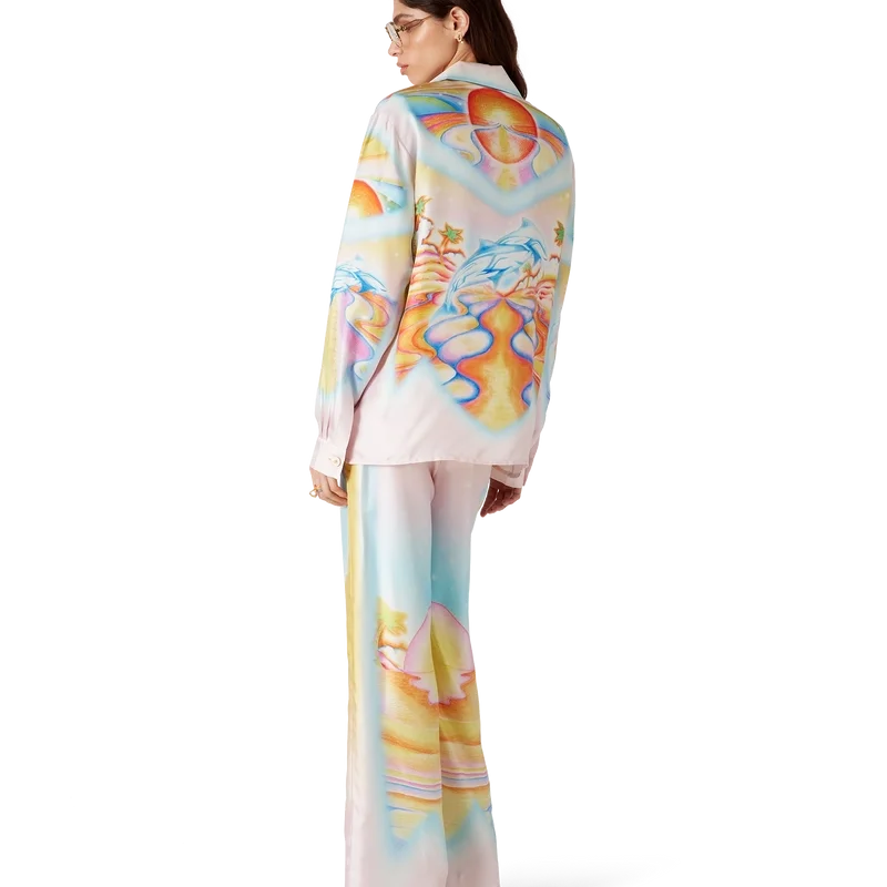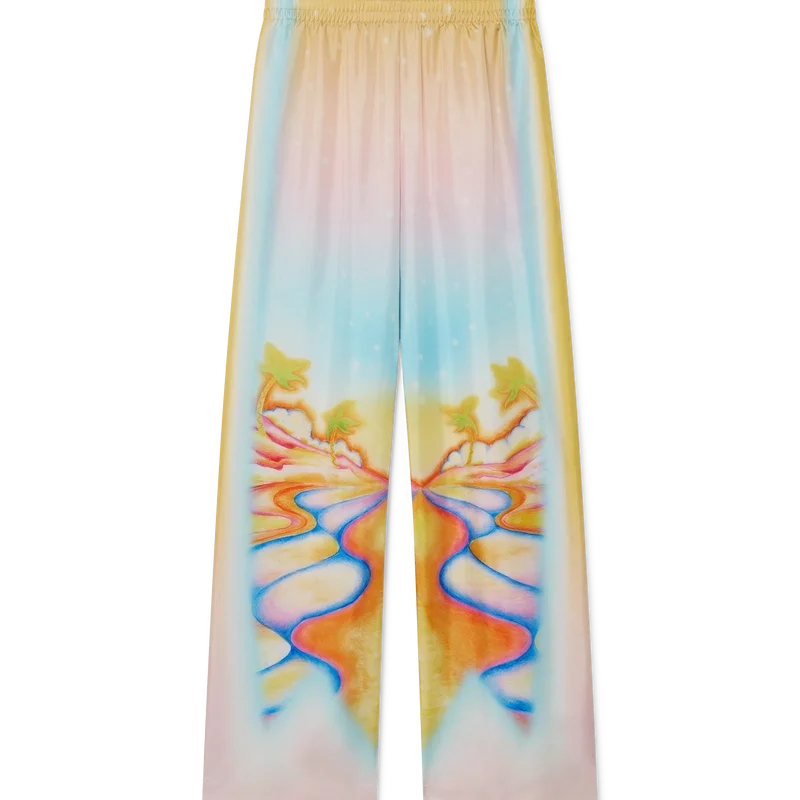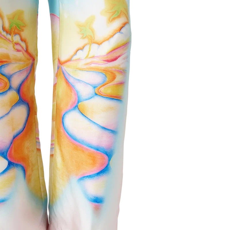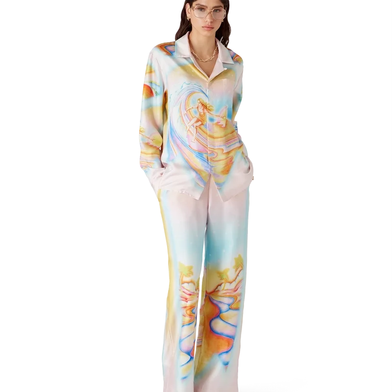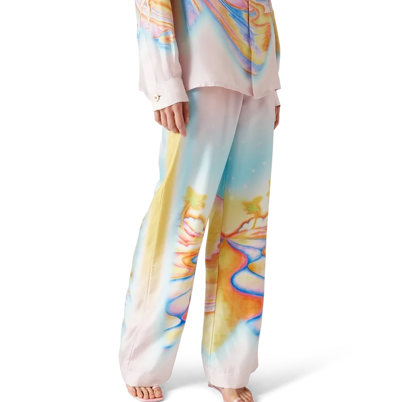 Psychedelic Nirvana-silkesbyxorna har ett heltäckande tryckt mönster och är tillverkade av silketwill med konstverk inspirerat av 70-talets airbrushmålade surfbrädor i Kalifornien i pastellfärger, vilket ger trycket en nästan drömlik, idealistisk känsla. Avslutade med elastisk midja, dragsko, sidofickor i sömmen och en påsydd bakficka.