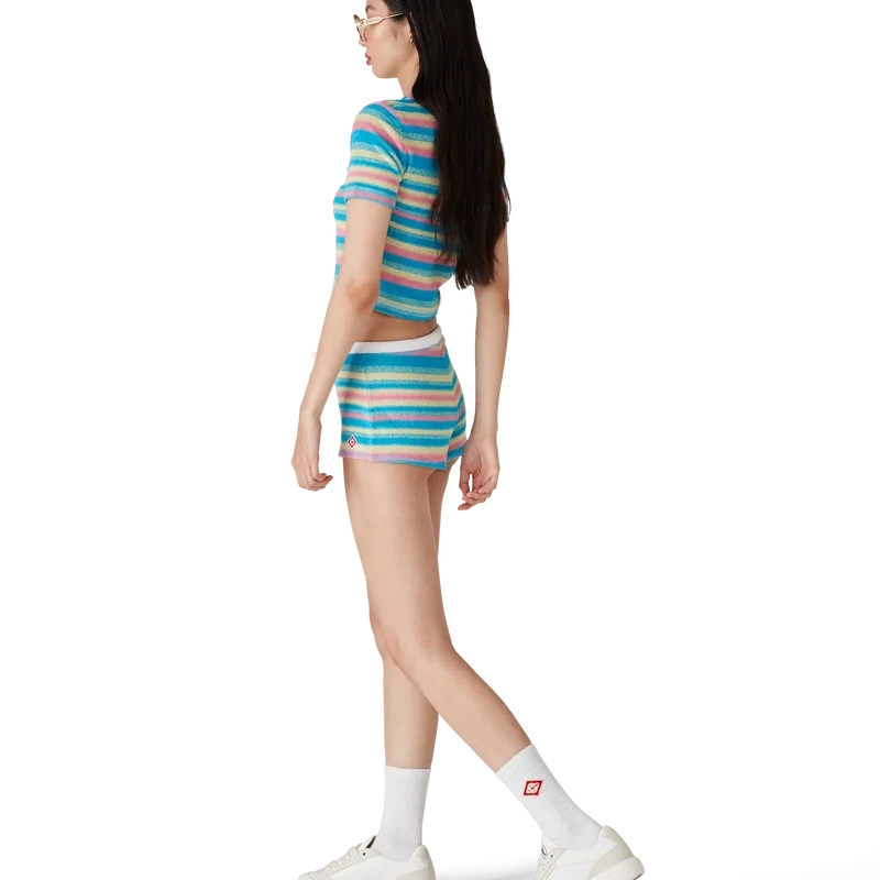 De randiga minishortsen i frotté är en kort modell tillverkad av frottétyg. De har en kontrasterande elastisk midjeresår, dragsko och är försedda med märkets signaturdiamantlogo.