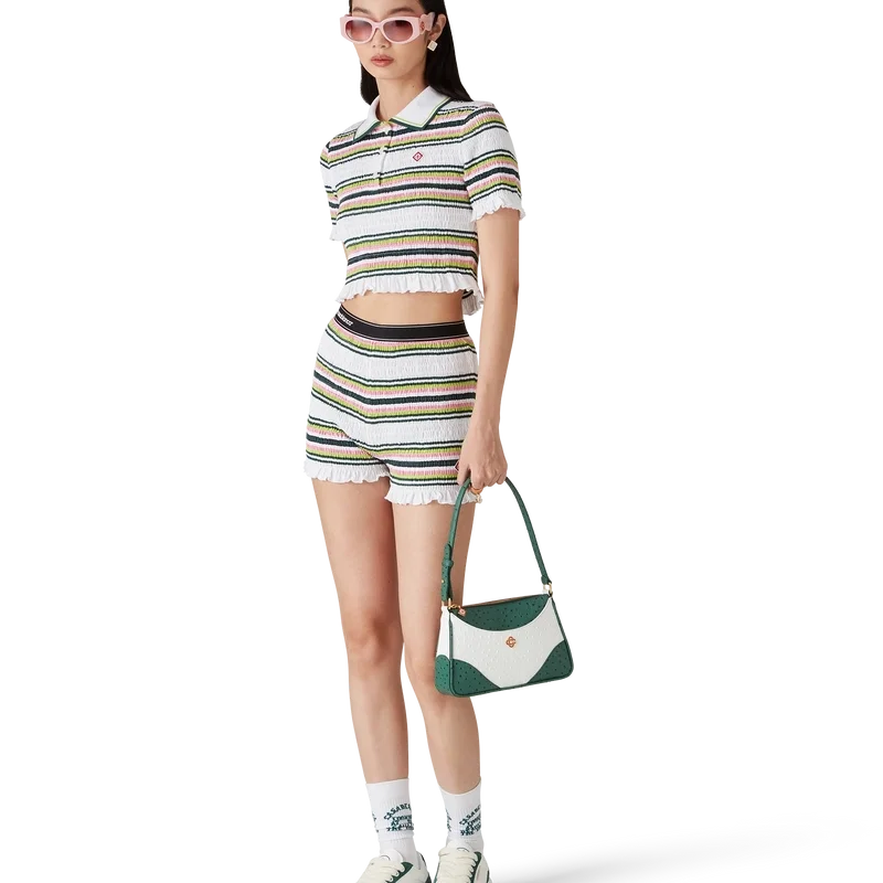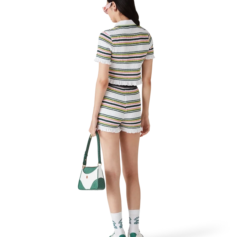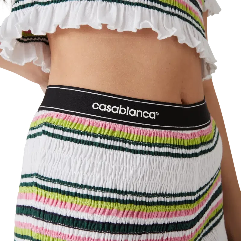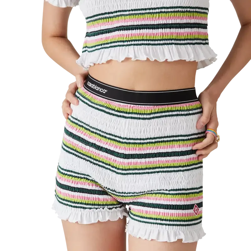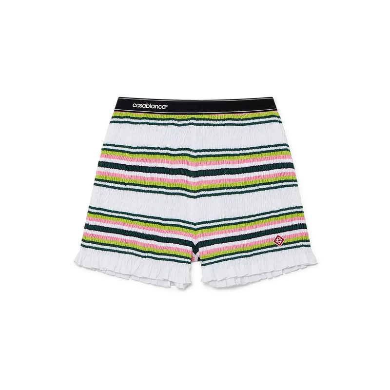De randiga rynkade Shortsen är en kort modell tillverkad av rynkat bomullstyg med husets signaturdiamantlogo. Kompletteras med ett elastiskt midjeband med Casablanca-logotyp och kantdetaljer samt volangdetaljer i nederkanten.