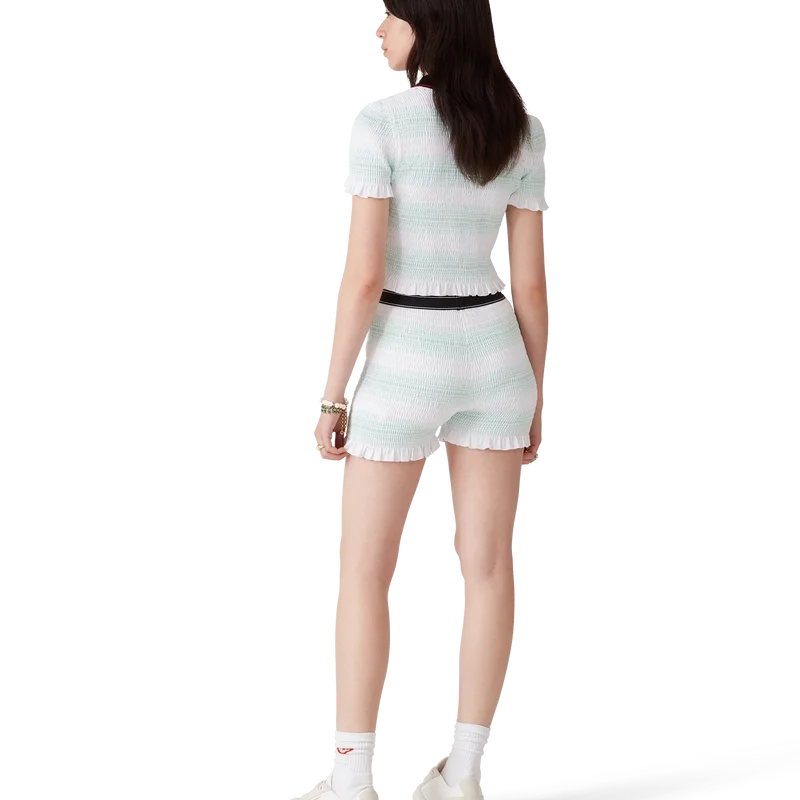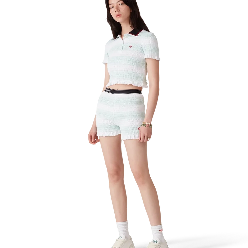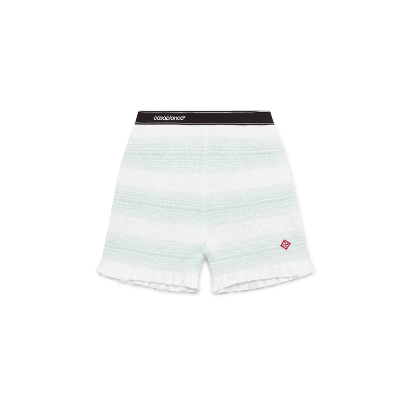 De randiga, rynkade Shortsen är en kort modell tillverkad av rynkat bomullstyg med husets signaturdiamantlogo. Kompletteras med ett elastiskt midjeband med Casablanca-logotyp och kantdetaljer samt volangdetaljer i nederkanten.