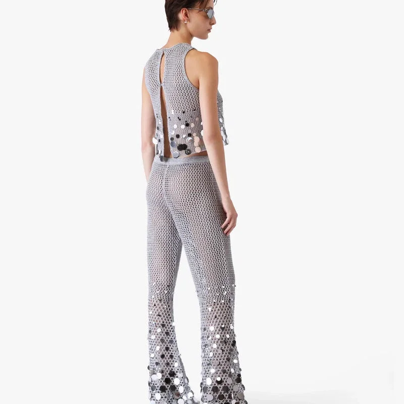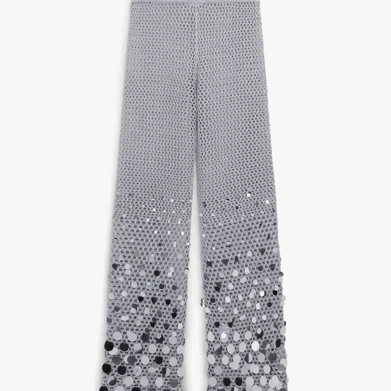De silverfärgade byxorna med spegelkrochet har en raffinerad stickad design med en delikat spegelkrochetkonstruktion i silver. Kompletteras med midjeband, utsvängd fåll och en fit-and-flare-silhuett.