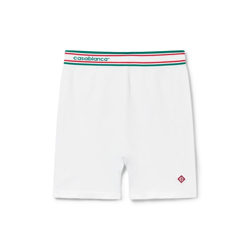 De sömlösa shortsen har en strömlinjeformad design inspirerad av sportkläder med märkets signaturmönster av tennisränder, Casablanca-logotyp och diamantlogotyp. Tillverkade i ett sömlöst stretchtyg som ger en raffinerad silhuett med minimalistisk konstruktion. Kompletteras med en smickrande passform, märkets signaturdiamantlogotyp, en elastisk midjeresår med märkets Casablanca-logotyp och randdetaljer.