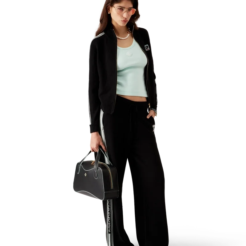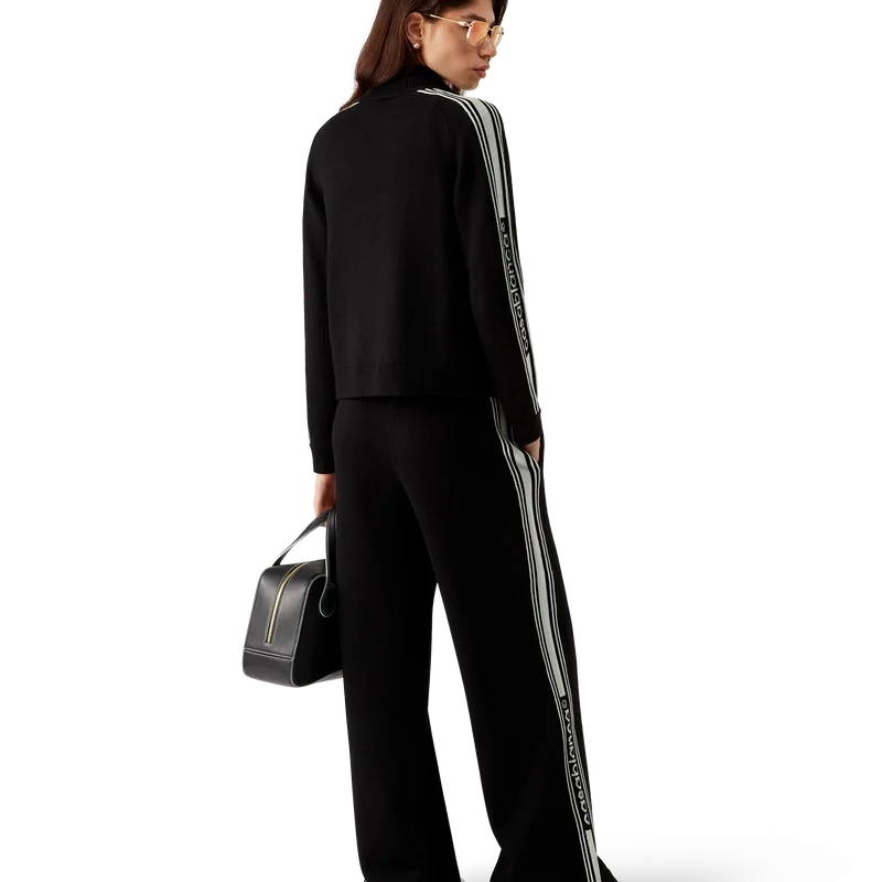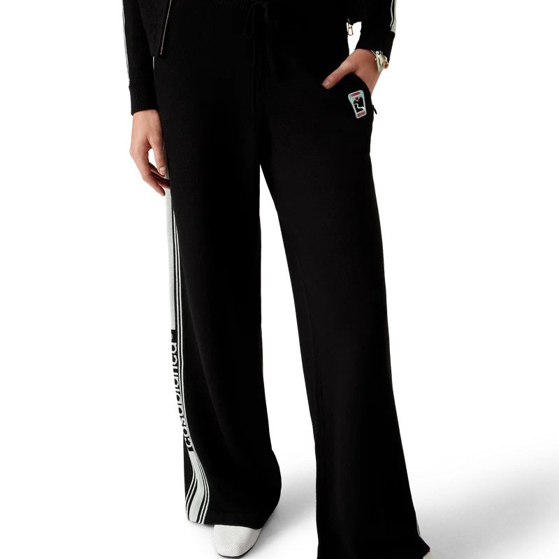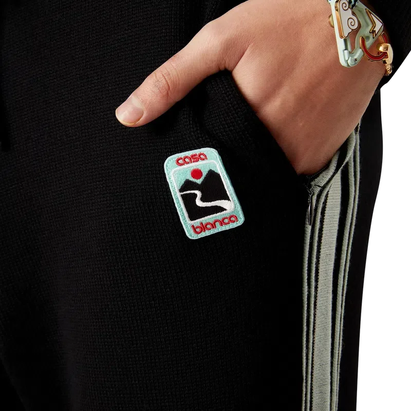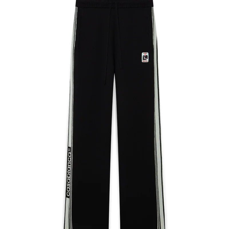 Merino Knit Track Pants är ett par raka stickade byxor tillverkade av merinoull. De har elastisk midja, dragsko, fickor i sömmarna, en påsydd bakficka, randiga detaljer längs sidorna och Casablanca-logotypen.