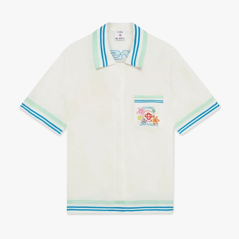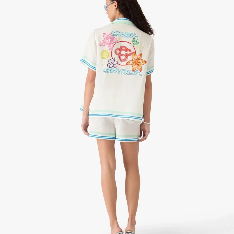 Den blommiga kortärmade silkesskjortan med kubansk krage är ett tryckt mönster med säsongens grafiska collage med tolkningar av logotypen, ett leende ansikte och en orkidé. Kompletterad med kubansk krage, knäppning, Corozo-knappar med sammanflätat CC-logo, bröstficka samt gröna, blå och vita randiga detaljer på krage, manschetter, nederkant och ficka, i en avslappnad silhuett.