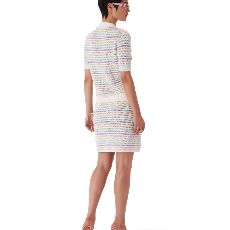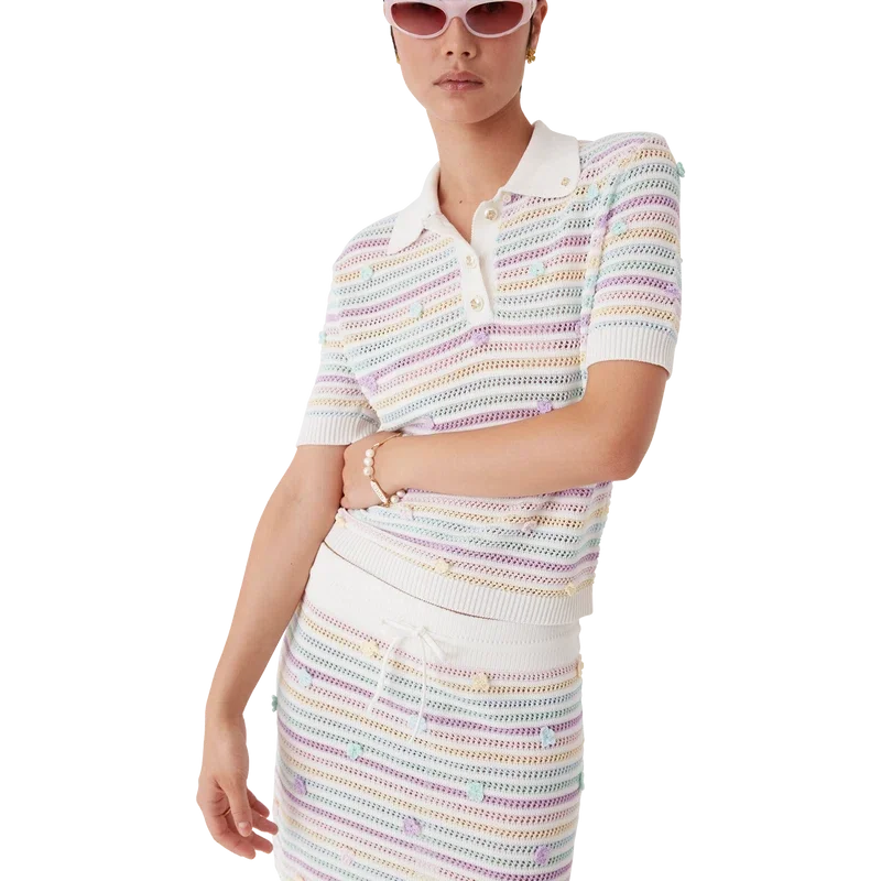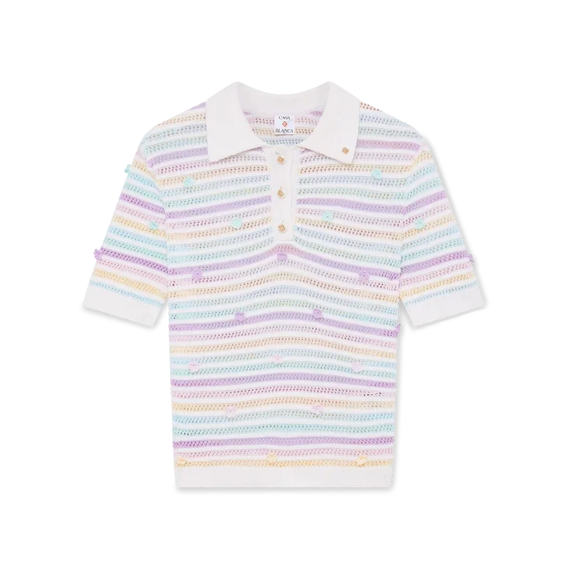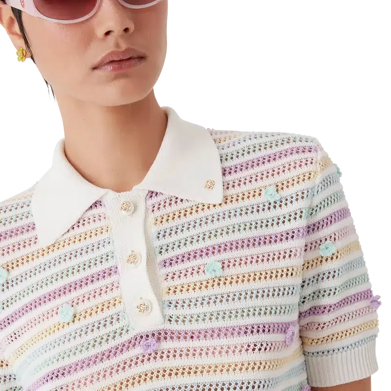Denna pikétröja i bomullskrochet med blommiga ränder är en klassisk kortärmad modell tillverkad i ett öppet vävt bomullstyg. Den har våra signaturknappar med guldkant och pärlor, blommotiv samt ribbad krage, muddar, knäppning och fåll.