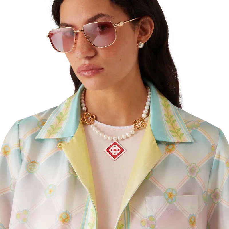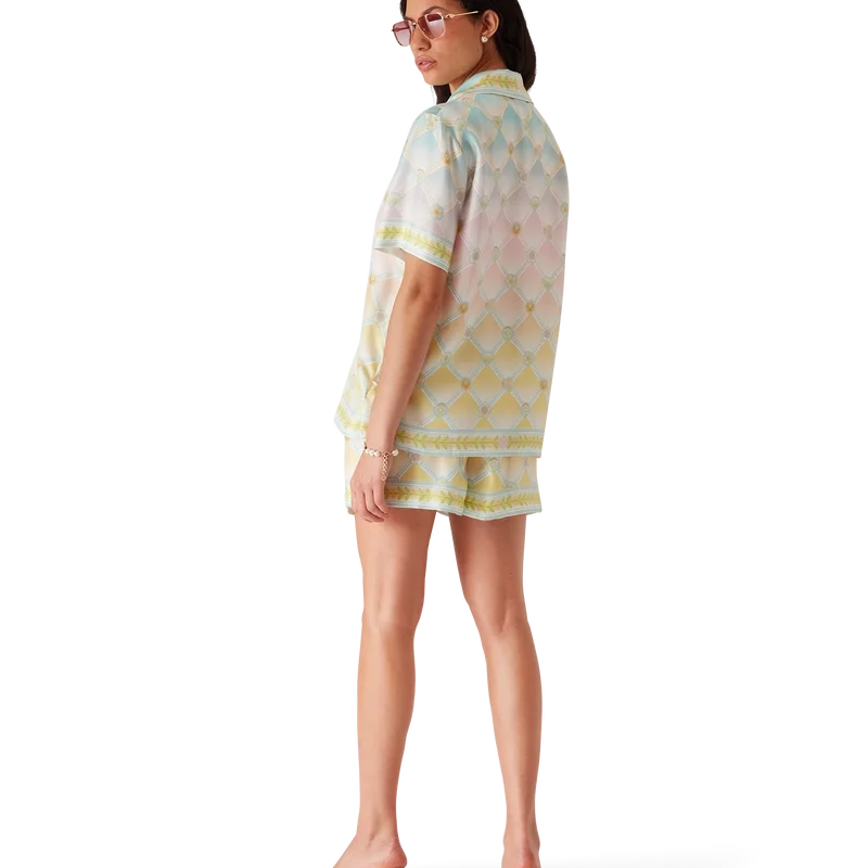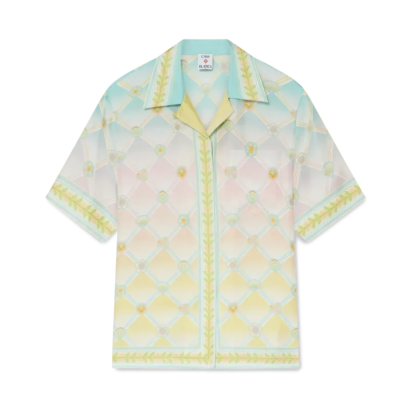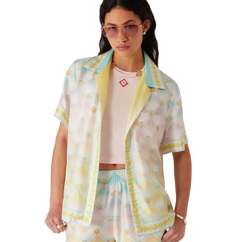 Candy Icons-skjortan i silketwill har ett heltäckande tryckt mönster tillverkat av silke med Candy Icons-mönstret, som skapats med pastellfärger och våra kawaii-ikoner i åtanke. Det är ett upprepande mönster som även innehåller en gradient-effekt. Avslutas med spetskrage, knäppning med corozo-knappar och en bröstficka med snygga sömmar.