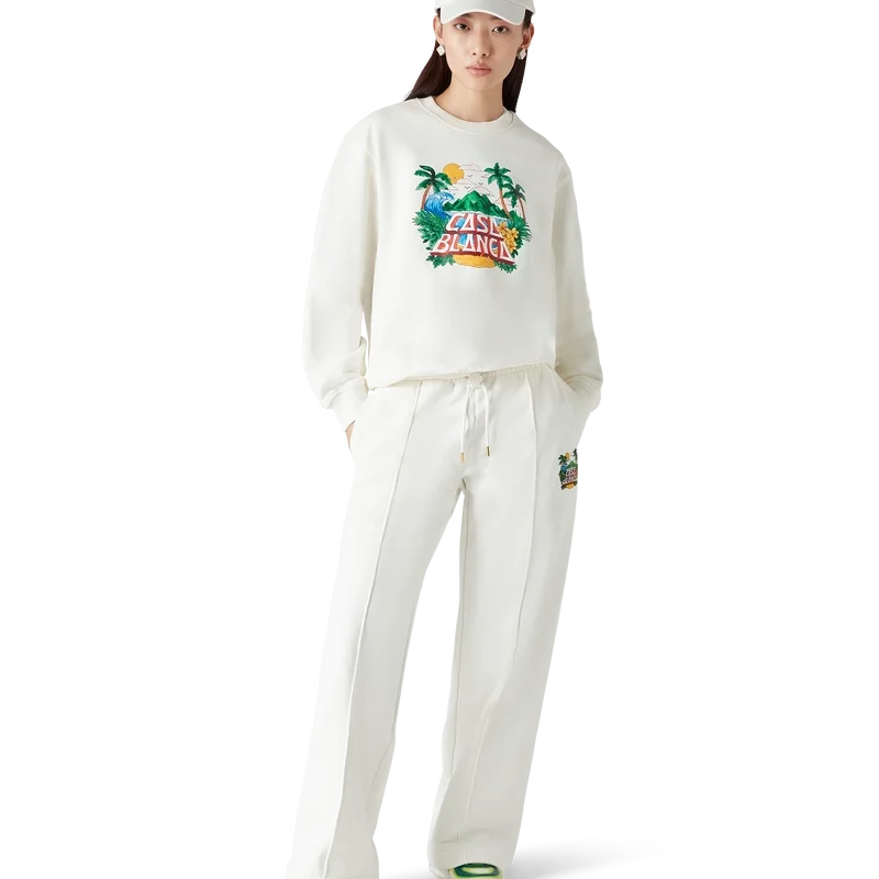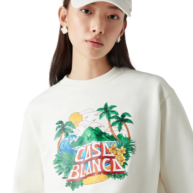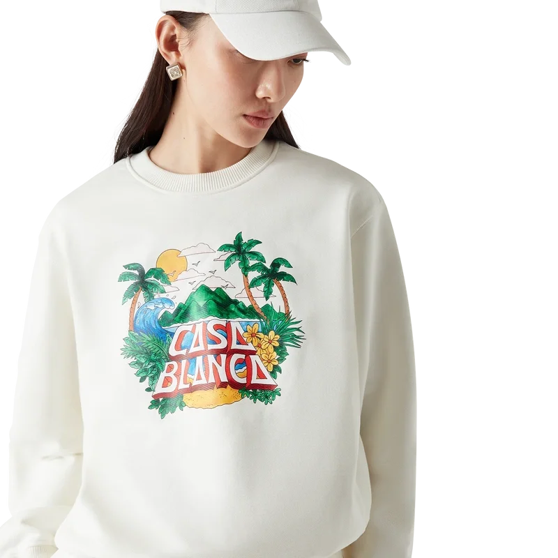 Casa Beach Wave-tröjan är en långärmad tröja med tryck, tillverkad av ekologiskt bomullstyg och med ett signaturmotiv som påminner om en souvenir-T-shirt man skulle köpa på en strandsemester. Avslutad med en klassisk rund hals.