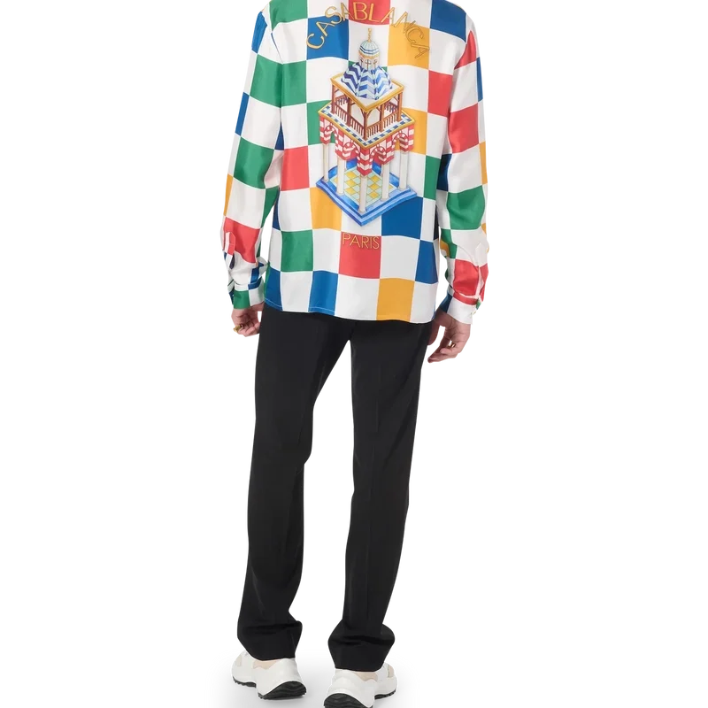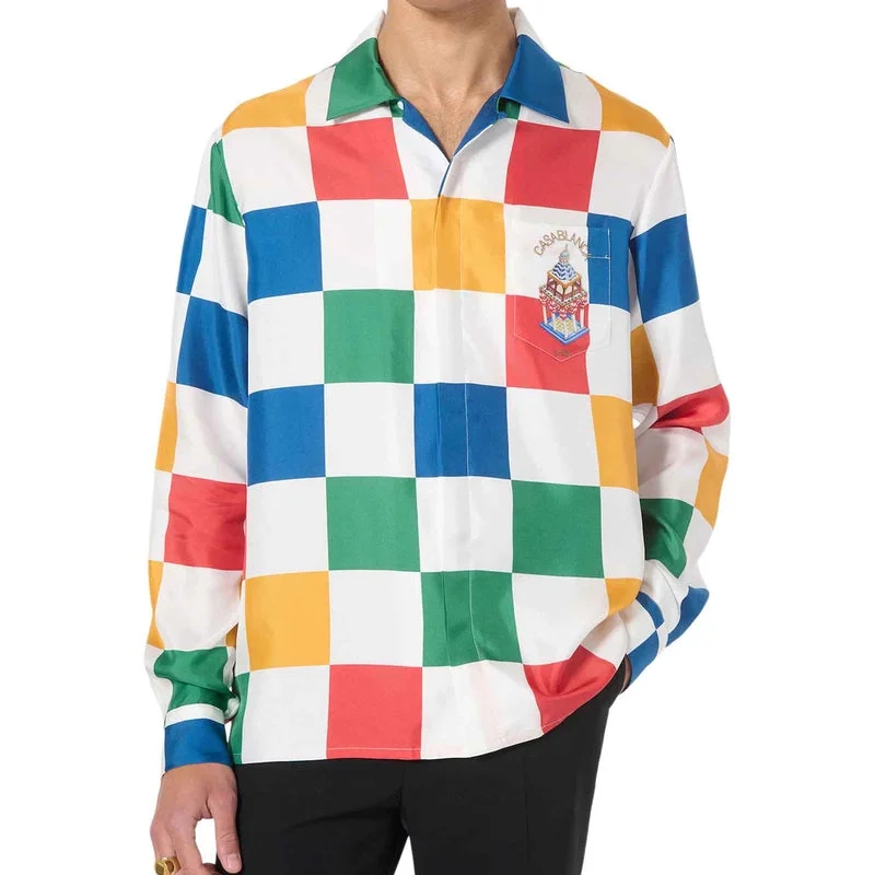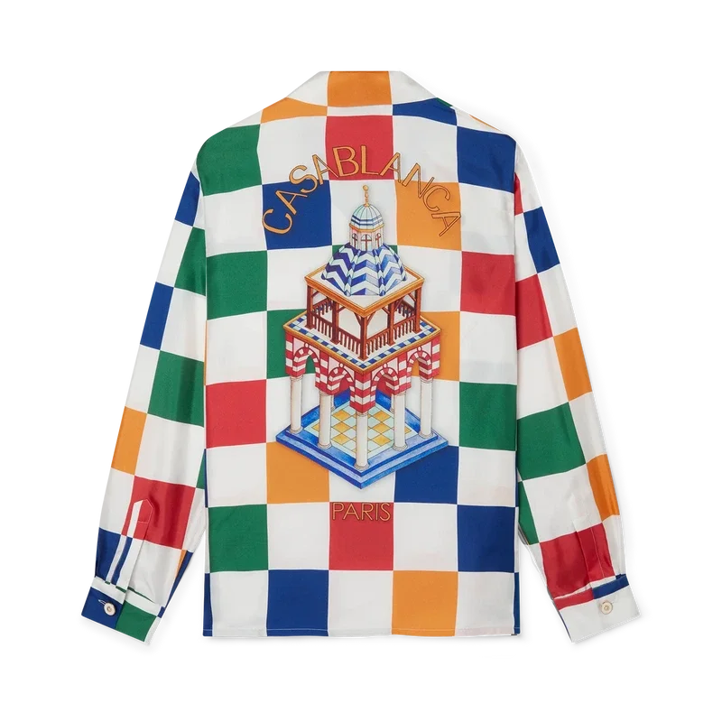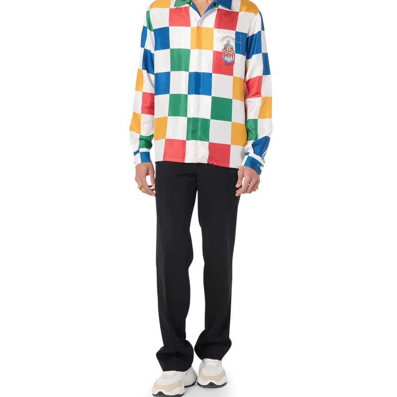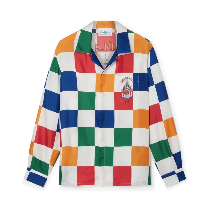 Casablanca Primary Check Silk Shirt är en tryckt långärmad skjorta med rutmönster över hela plagget – en hyllning till arabiska bordsspel. Kompletterad med säsongsbetonat tryck på ryggen och bröstfickan. Avslutad med en krage avsedd att bäras öppen och knäppning framtill.
