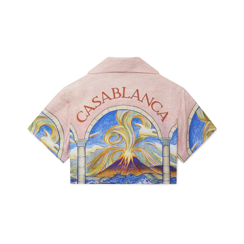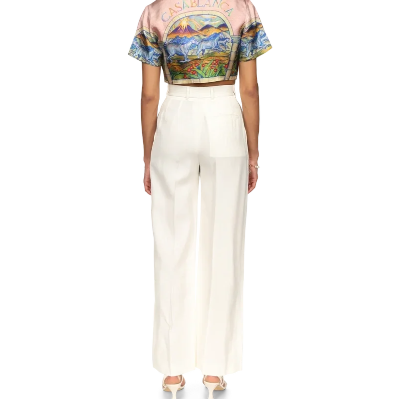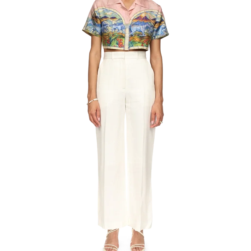 Den korta silkesskjortan Chevaux Sauvages har ett säsongsbetonat tryck från Futuro Optimisto-kollektionen. Den har en utsvängd krage och knäppning som är avsedd att bäras öppen.