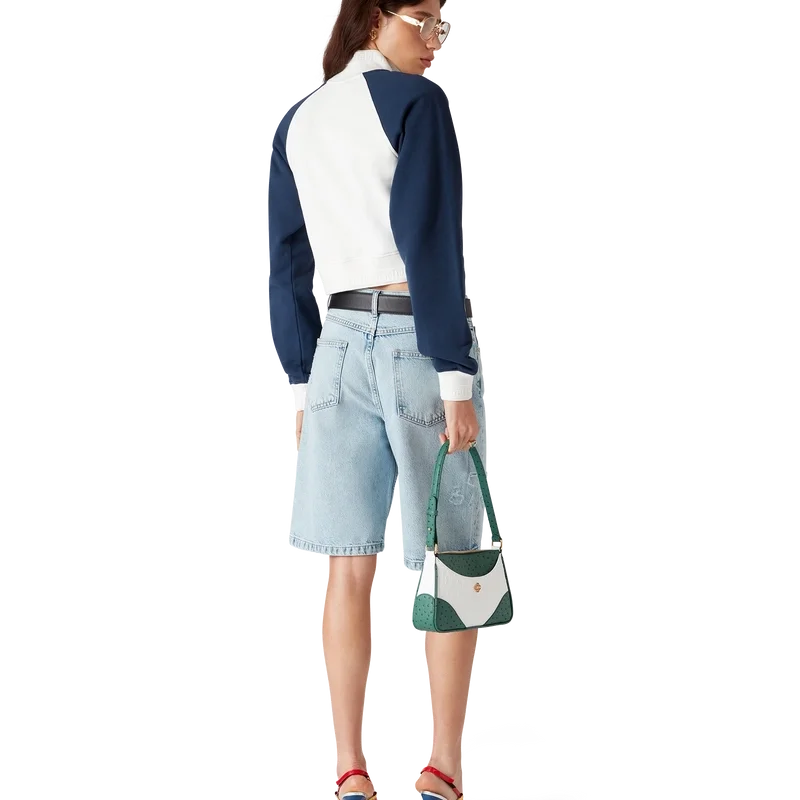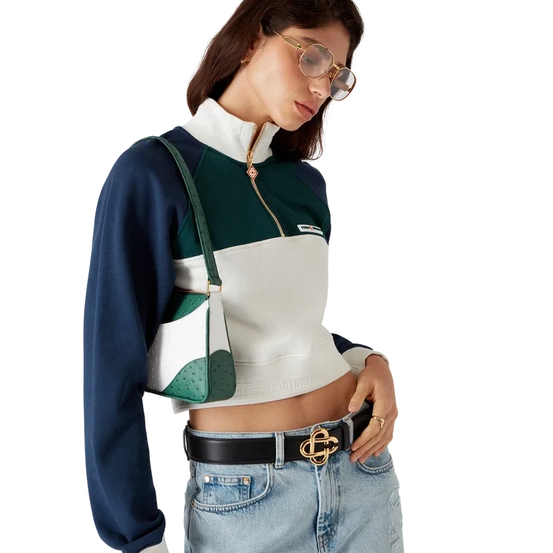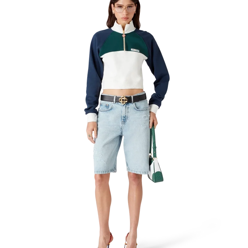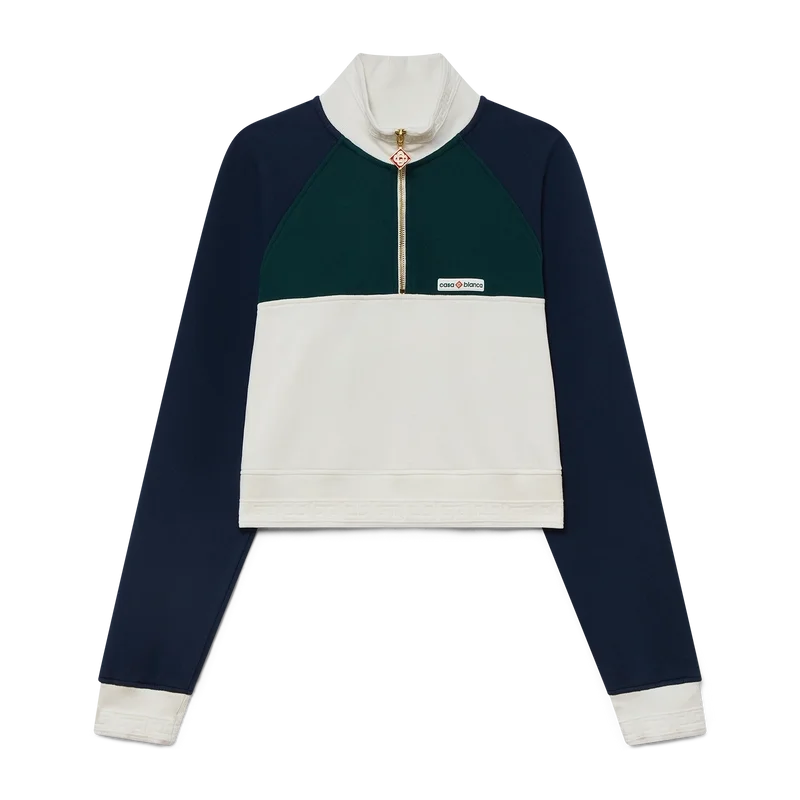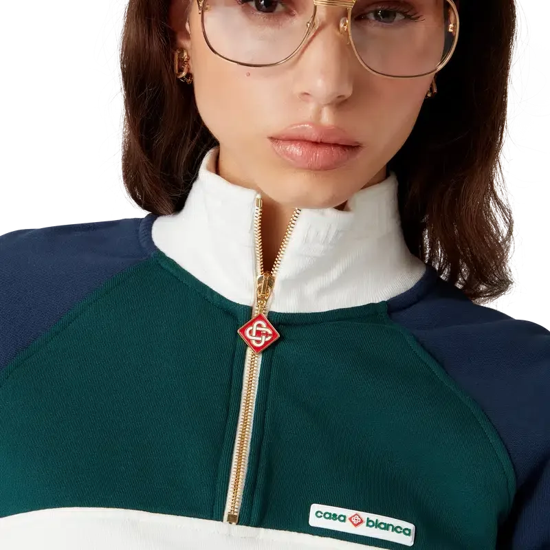 Den färgblockerade korta tröjan med kvartslång dragkedja är en långärmad sporttröja tillverkad av ekologisk bomull. Den är försedd med märkets Casablanca-logotyp, färgblockerade paneler samt ribbad krage, muddar och nederkant med randiga detaljer.