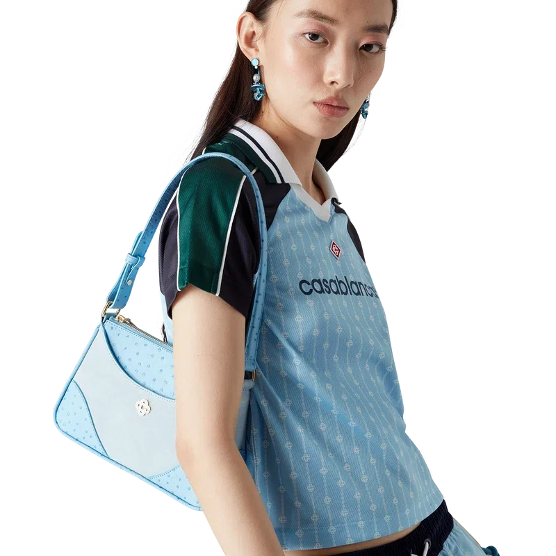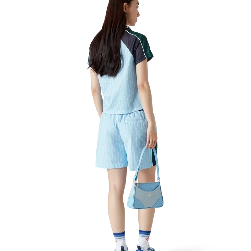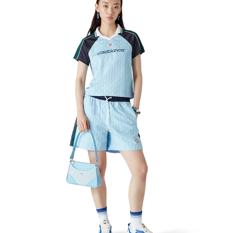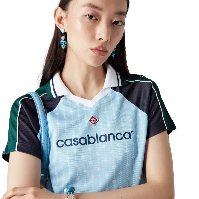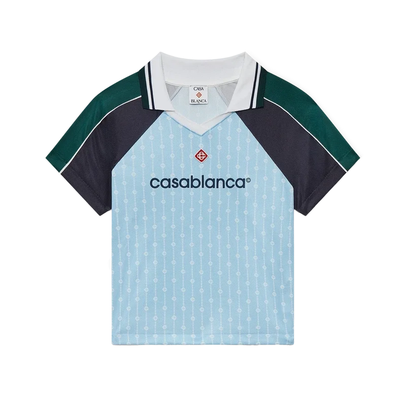 Fotbollströjan Pinstripe Laurel är en kortärmad sporttröja tillverkad i ett Birdseye-nätmaterial med märkets karakteristiska sammanflätade CC-logotyp. Den kompletteras med svarta och gröna paneler på axlarna och ärmarna, en karakteristisk diamantlogotyp, Casablanca-logotypen, vit kantband, en ribbad V-ringning samt en krage med randiga detaljer i svart, vitt och grönt.