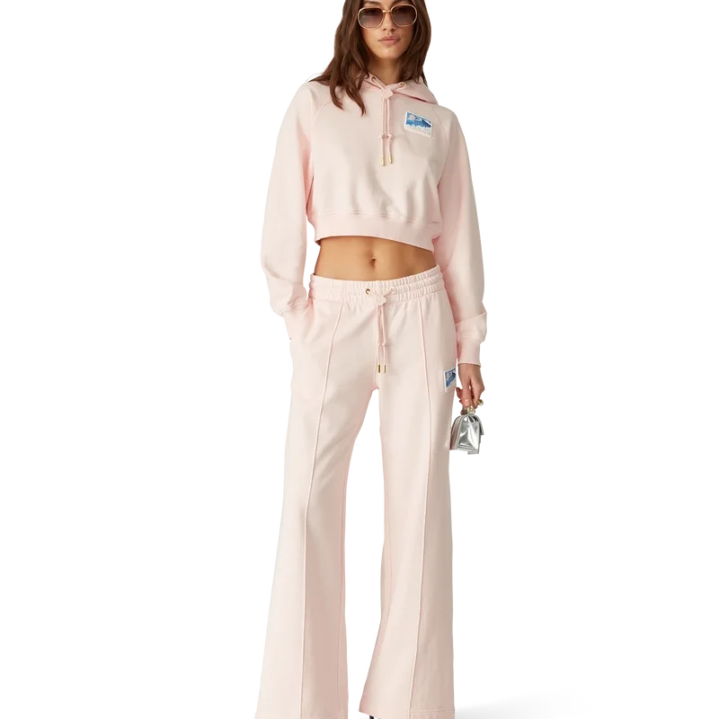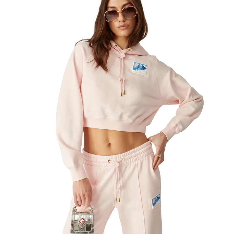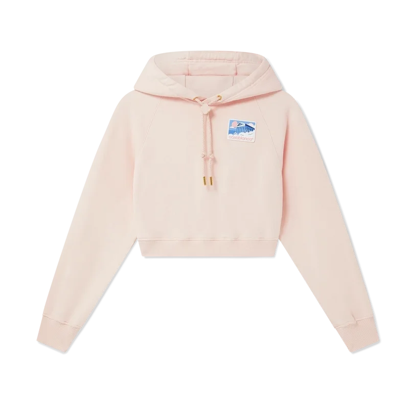 Den korta hoodien Greek Temple är tillverkad av ekologisk bomull och har en silikonlapp. Den har huva, dragsko med guldspetsar och märkesknop för säker fastsättning samt ribbade muddar och nederkant.