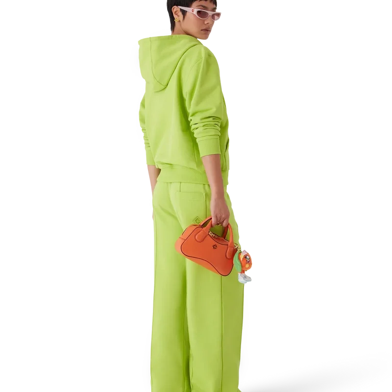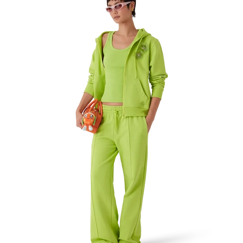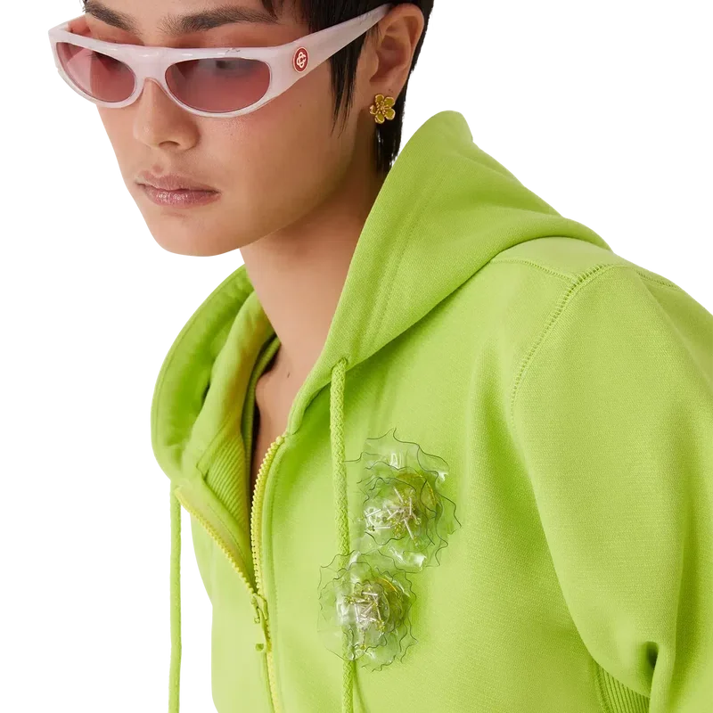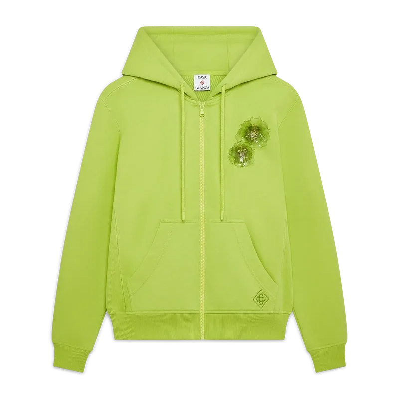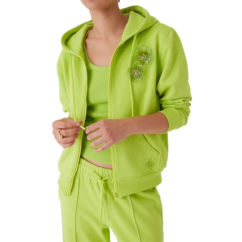 Huvtröjan med dragkedja är en långärmad sporttröja i limegrönt med två avtagbara blombroscher. Den har en huva med dragsko, dragkedja, påsydda fickor fram, ribbade muddar och ribbad nederkant.
