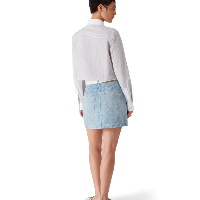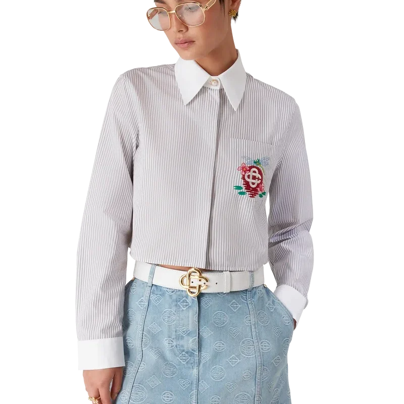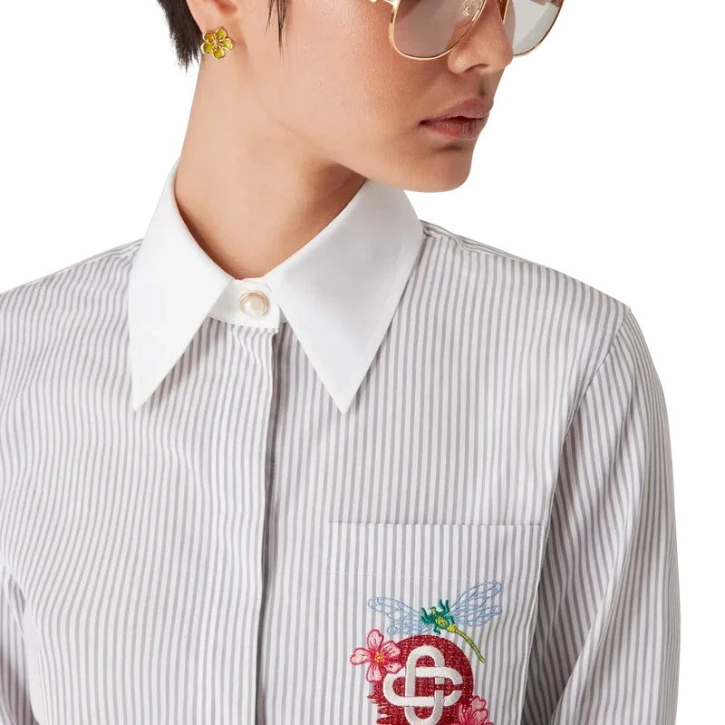 Den randiga korta långärmade skjortan är en kort modell tillverkad av ett bomullstyg av typen Barra. Den har knäppning, Cc-logotypknappar i corozo, signaturknappar med guldkant och pärlor vid kragen och manschetterna, en bröstficka med säsongens blommönster med trollsländor samt kontrasterande vit spetskrage och manschetter.