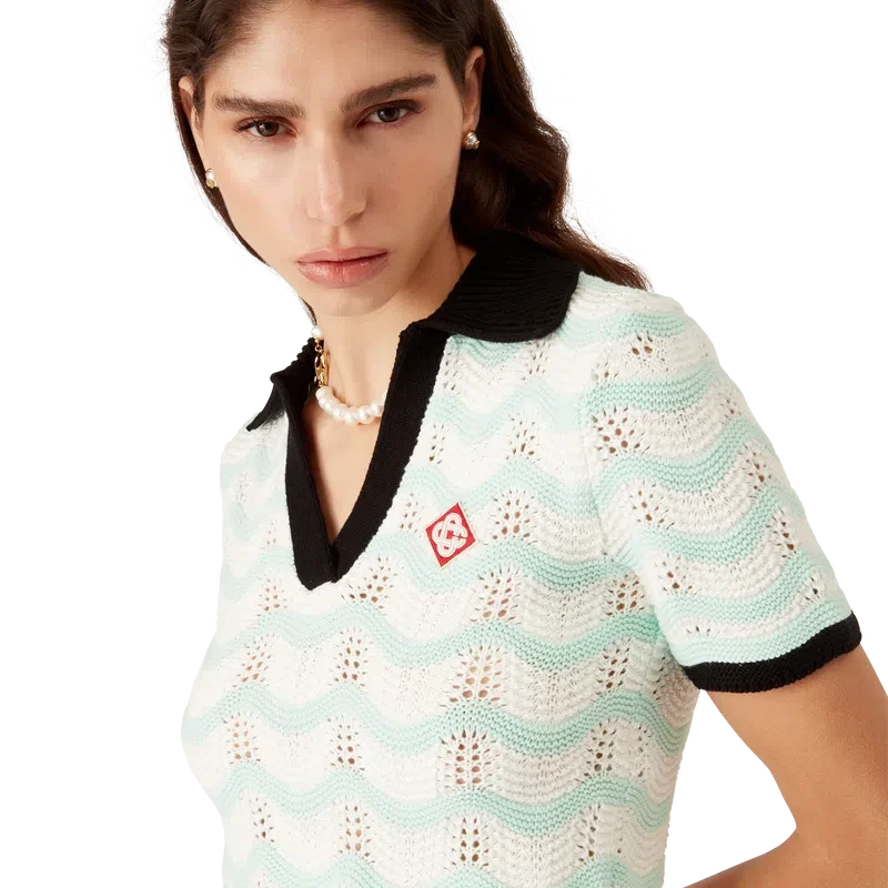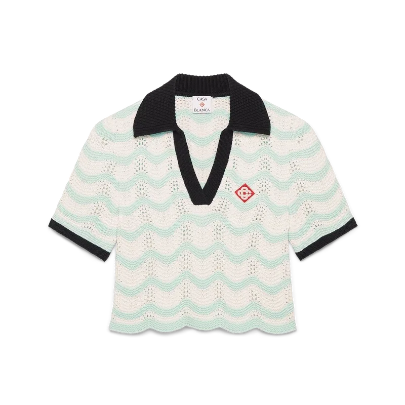 Cotton Wave Crochet Cropped Pikétröja är en kortärmad modell med husets signaturdiamantlogotyp tillverkad av virkat bomullstyg. Komplett med V-ringning, krage, våginspirerad fåll och svart kontrasterande ribbad knäppning, muddar och krage – designad för att sitta ovanför naveln.