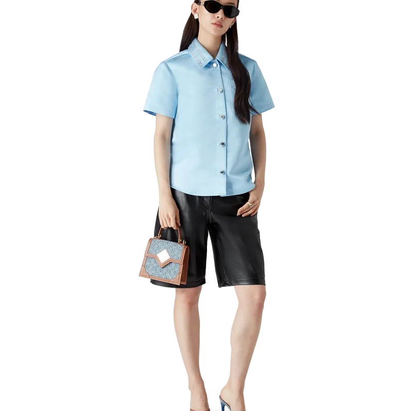 Den kortärmade skjortan i satin är en klassisk design tillverkad av satintyg. Den har knäppning, guldpläterade knappar med märkeslogotyp, spetskrage, rundad fåll, bröstficka samt pärldekor på kragen och bröstfickan.