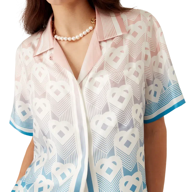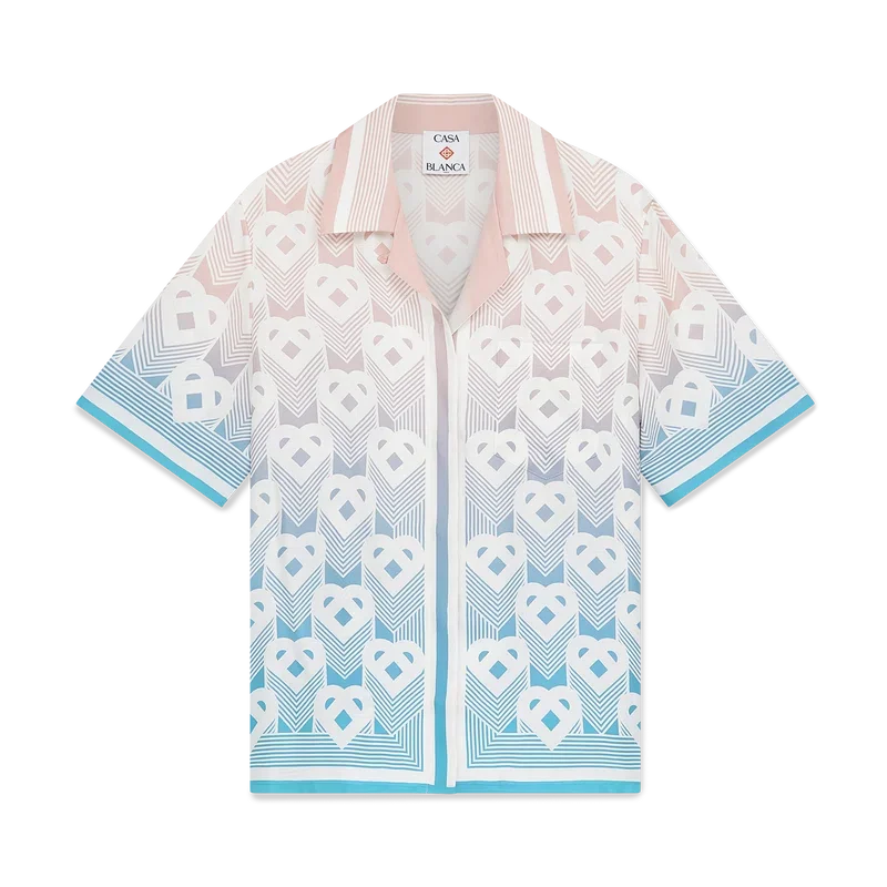 Den kortärmade skjortan i siden med gradienthjärtmonogram har ett heltäckande tryck med husets hjärtmonogram på en rosa och blå gradientbakgrund. Tillverkad i monogram-sidentwill och avslutad med kubansk krage, bröstficka samt krage, manschetter, nederkant och knäppning med randiga detaljer.
