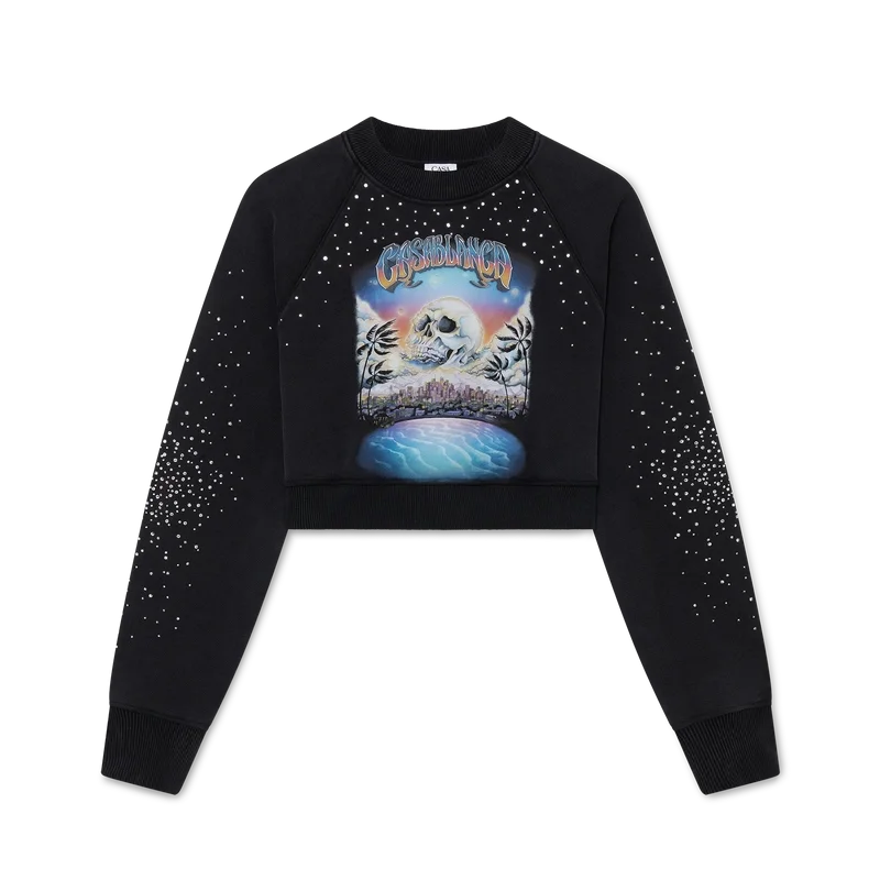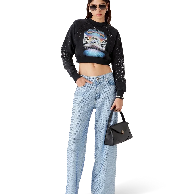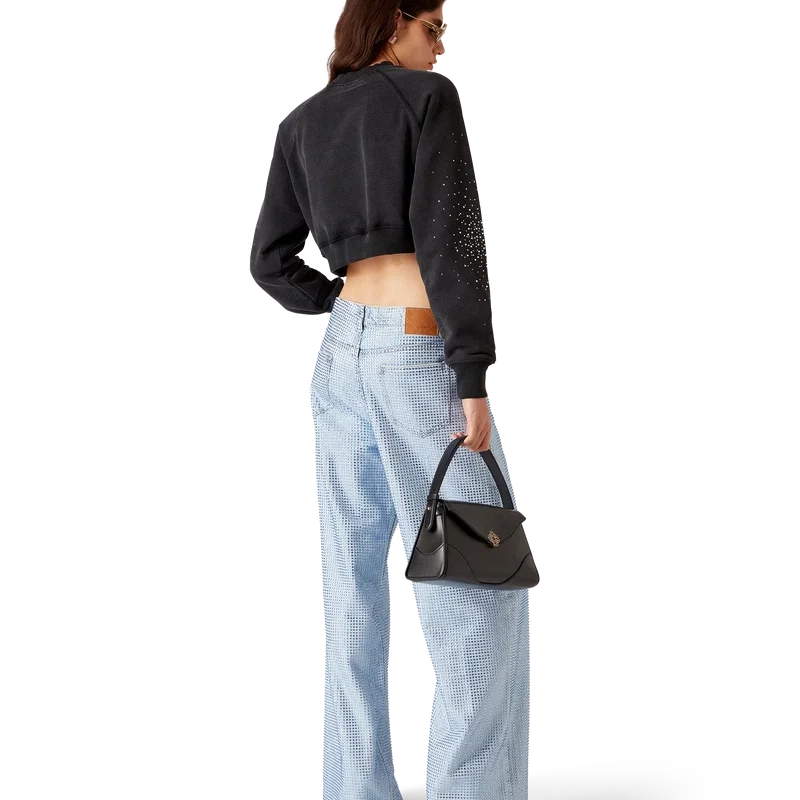 La Pramonition-shortsen med kristallprydnader är knälånga med en avslappnad silhuett, tillverkade av denimtyg och heltäckande hotfix-glaspärlor. De har foder, fickor fram och bak, dragkedja och bälteshällor.<!–