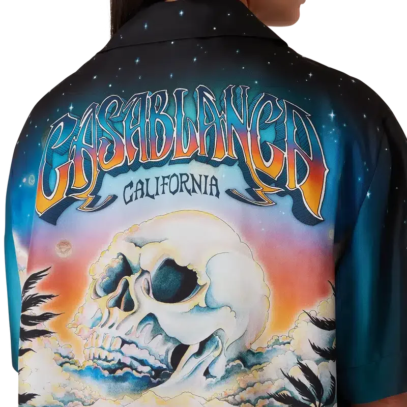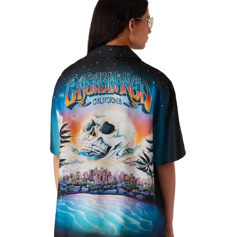 La Pramonition-silkesskjortan är en kortärmad skjorta med tryck, med motiv inspirerat av en kuslig vision av La Pramonitions silhuett på natten, med UFO-element som anspelar på vintage-science fiction. Kompletterad med kubansk krage, bröstficka, dold knäppning och sammanlänkade CC-knappar i corozo.