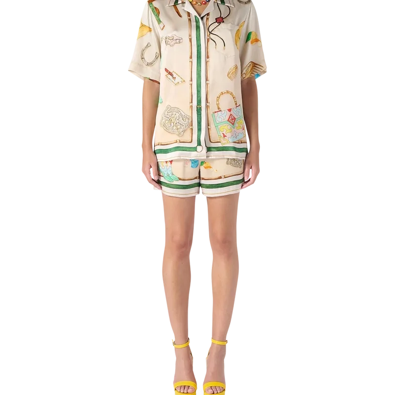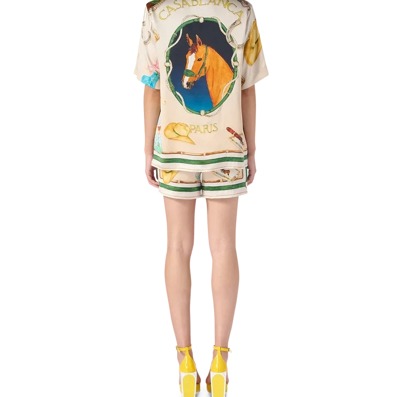 L’ecurie Blanche silkesskjorta med kubansk krage är en kortärmad modell med tryck som visar säsongens Casablanca-symbolik. Den har en krage som är avsedd att bäras öppen, ett Casablanca Paris-märkesetikett och knäppning framtill, och är designad för en smal passform.