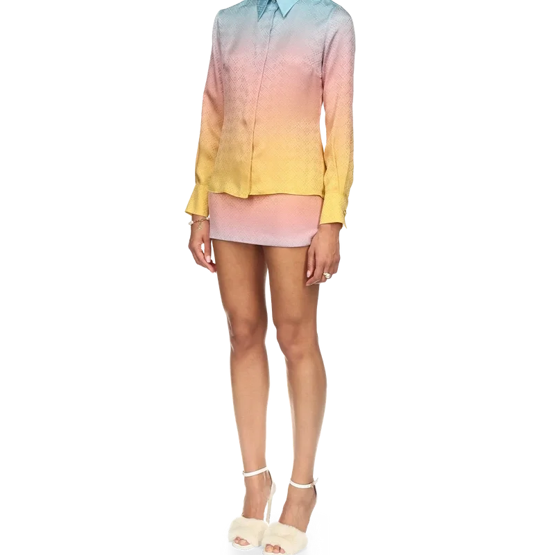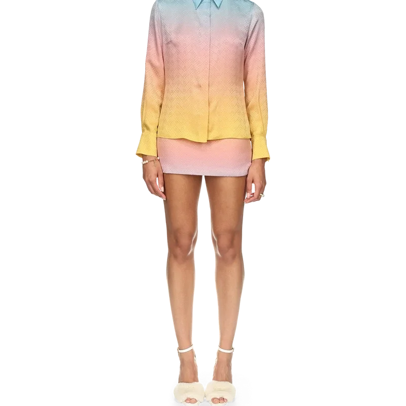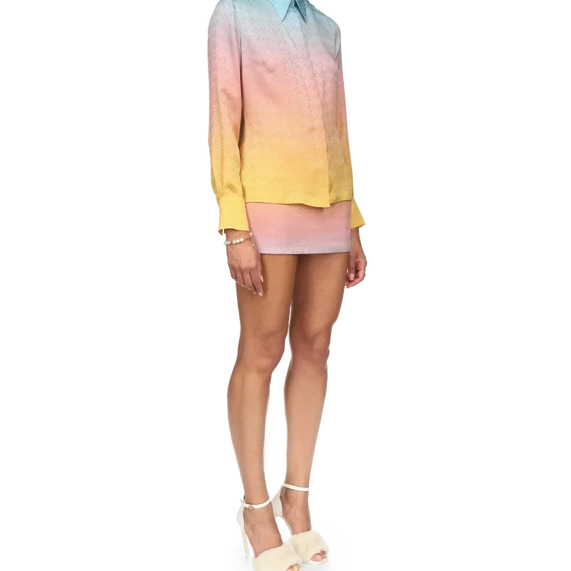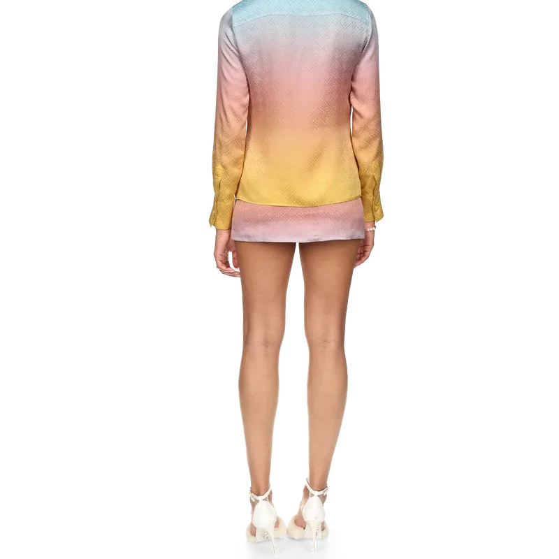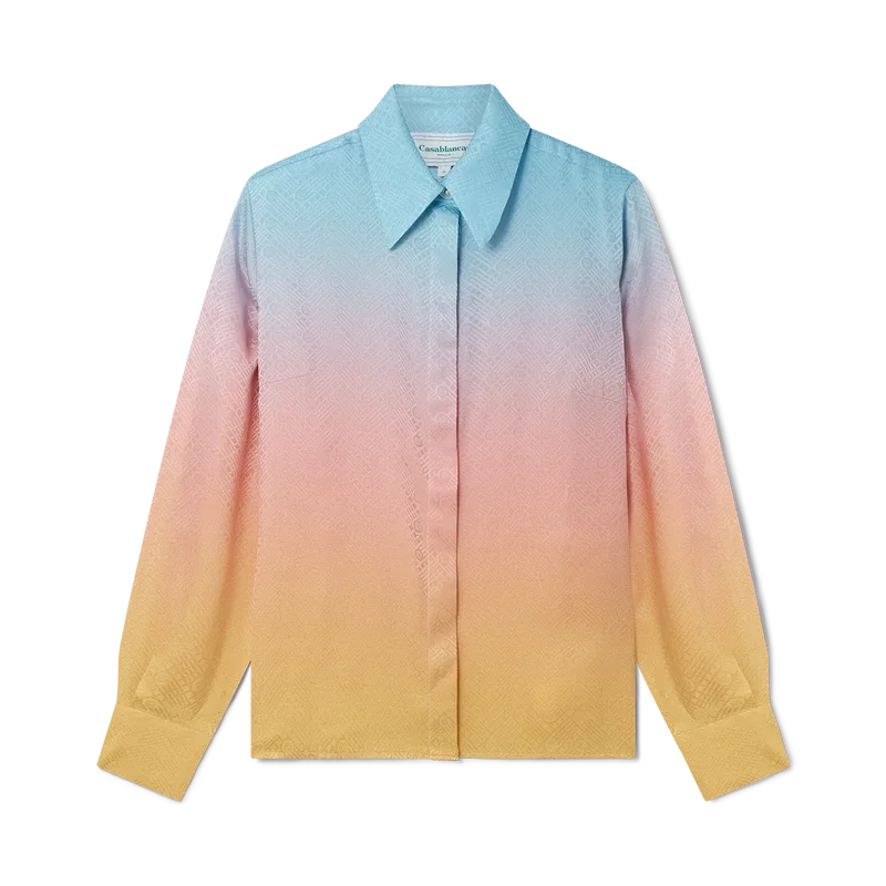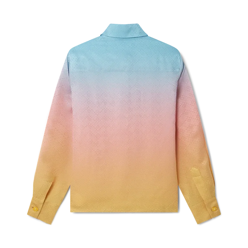 Ping Pong Gradient Silk Shirt är en skjorta med heltryckt mönster som föreställer Ping Pong-monogrambollen i rörelse, hämtat från husets Japan-kollektion. Denna skjorta är tillverkad av silketwill och har knäppning fram, guldkantade emaljknappar och en Casablanca-märkesetikett.