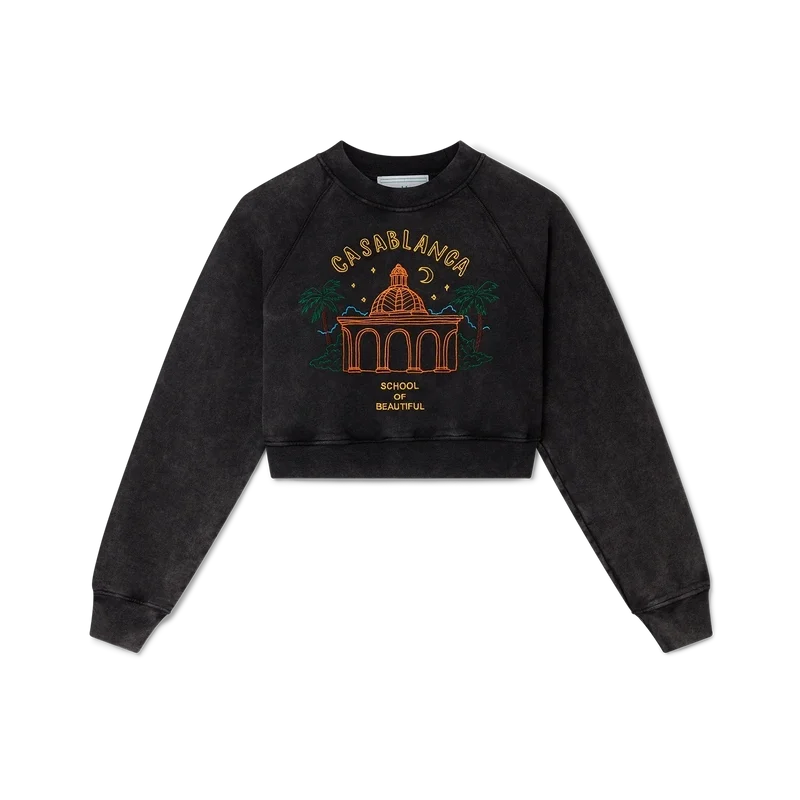 School of Beautiful kort tröja är en svart jerseytröja i blekt utseende med broderat motiv över bröstet. Tröjan är tillverkad av 100 % ekologisk svart bomull och har en klassisk rund hals, långa ärmar och en kort passform som slutar ovanför naveln.