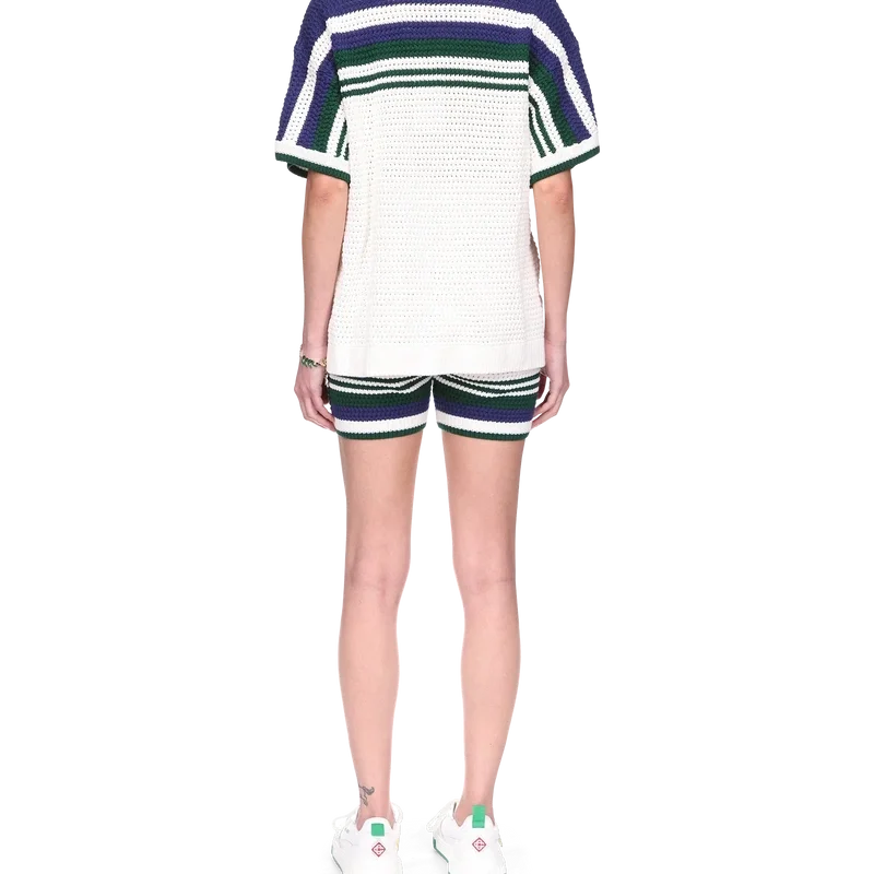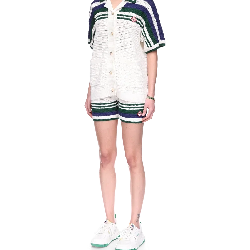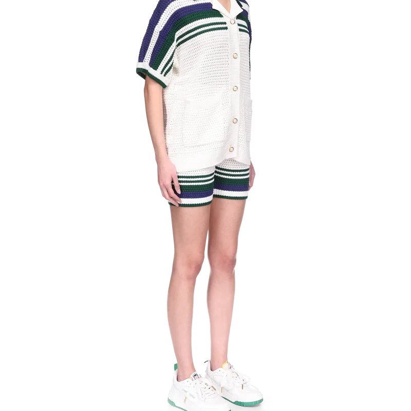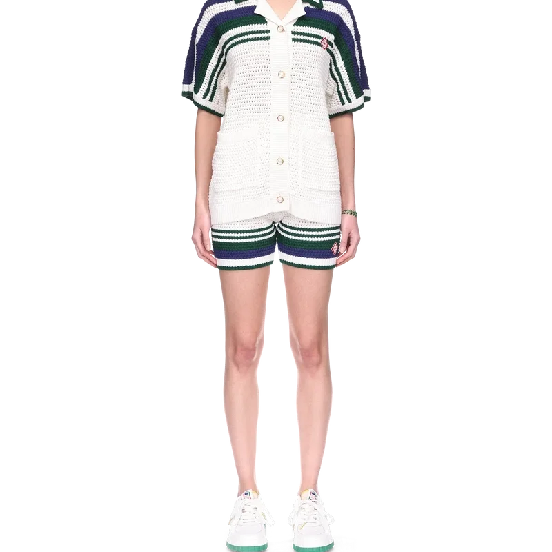 Tennisskjortan i virkat bomull för damer är en stickad bomullsdesign med husets signaturlogotyp, den sammanflätade Cc-diamanten. Den har kontrastkant på den ribbade kragen och manschetterna, knäppning, randiga detaljer över bröstet, axlarna och ärmarna, signaturknappar med guldkant och påsydda fickor fram.