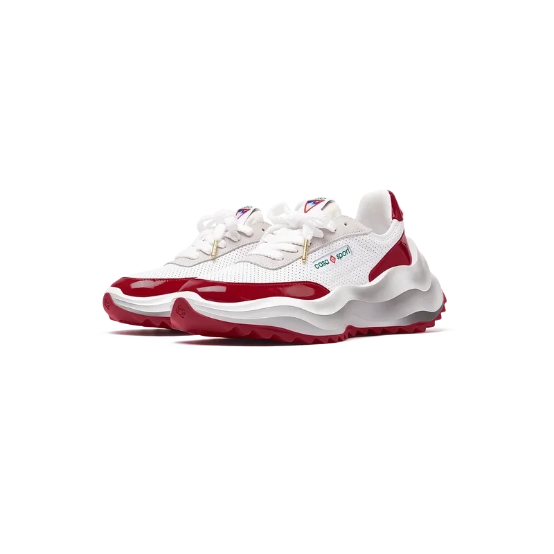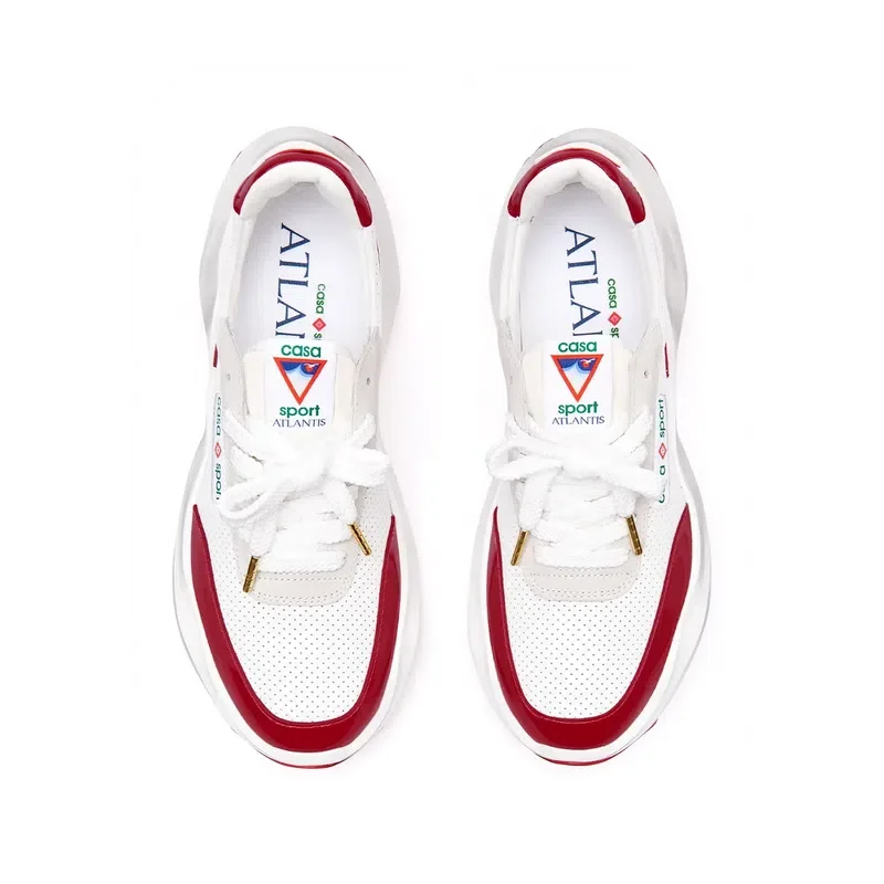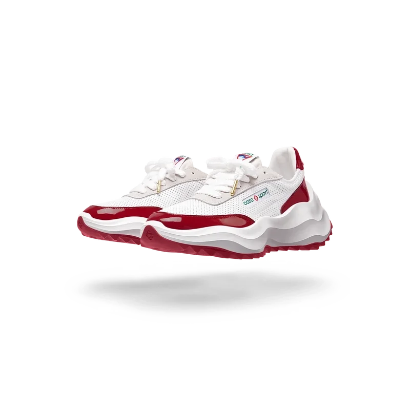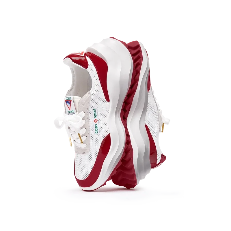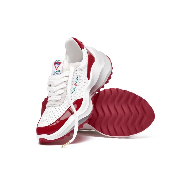 Överdrag i tonat Haute Red-lackläder, ovandel i perforerat läder, kontrasterande snörning i mocka, Casablanca-diamantmärke i gummi på hälfliken, vävd Casa Sport-etikett på sidan, vävd Atlantis-etikett på tungan, skulpterad EVA Wave-mellansula, yttersula i gummi, guldfärgade snörspetsar
