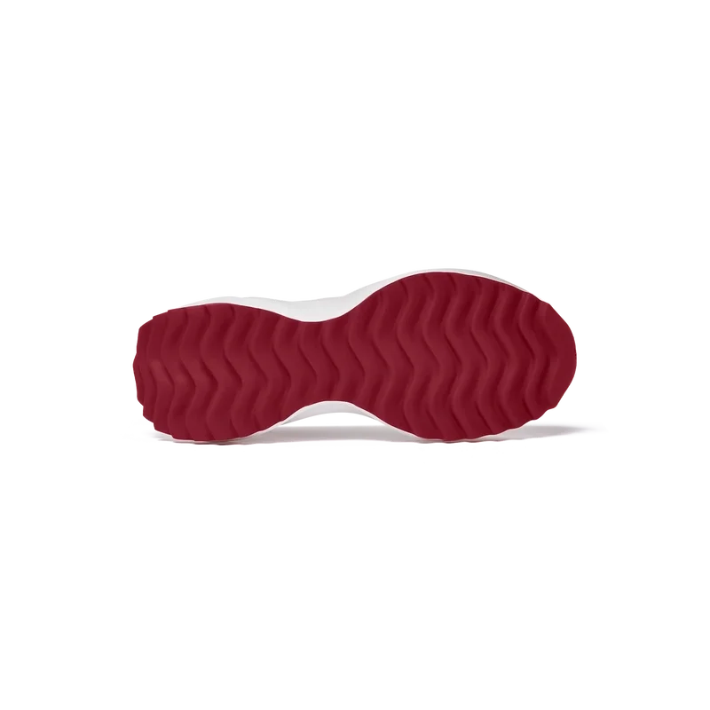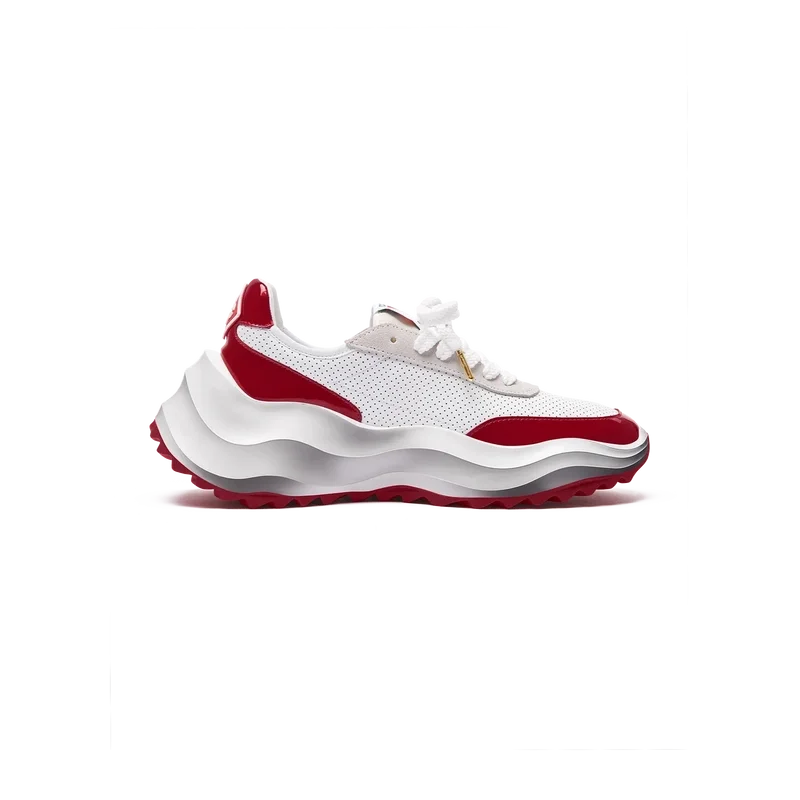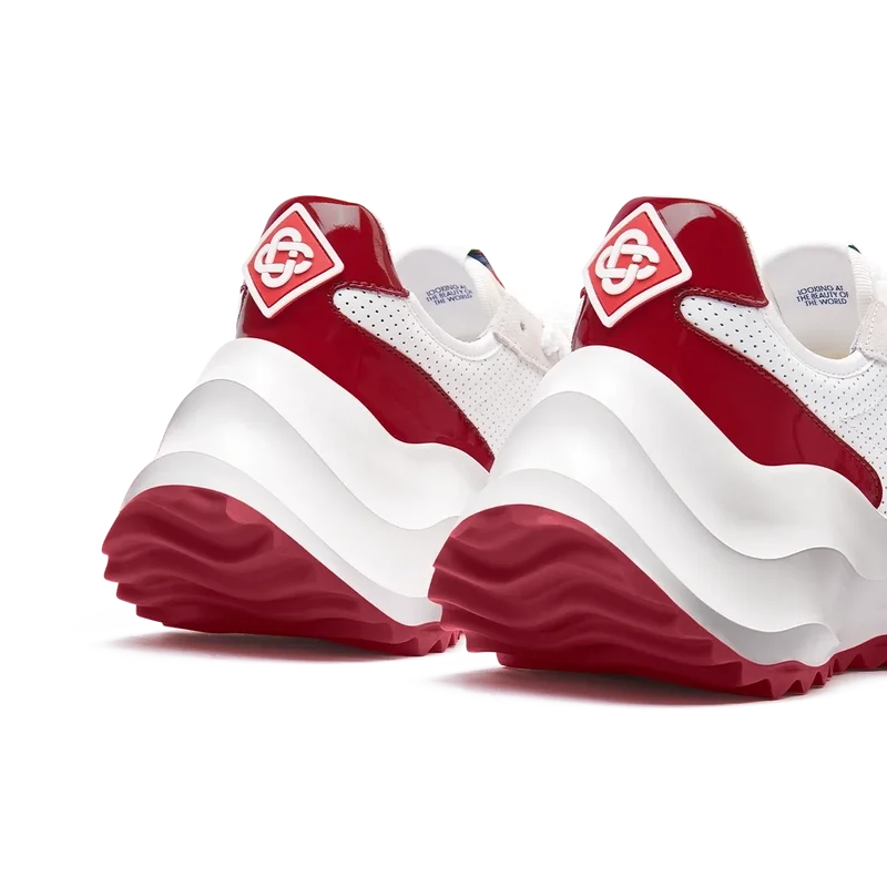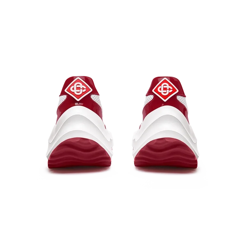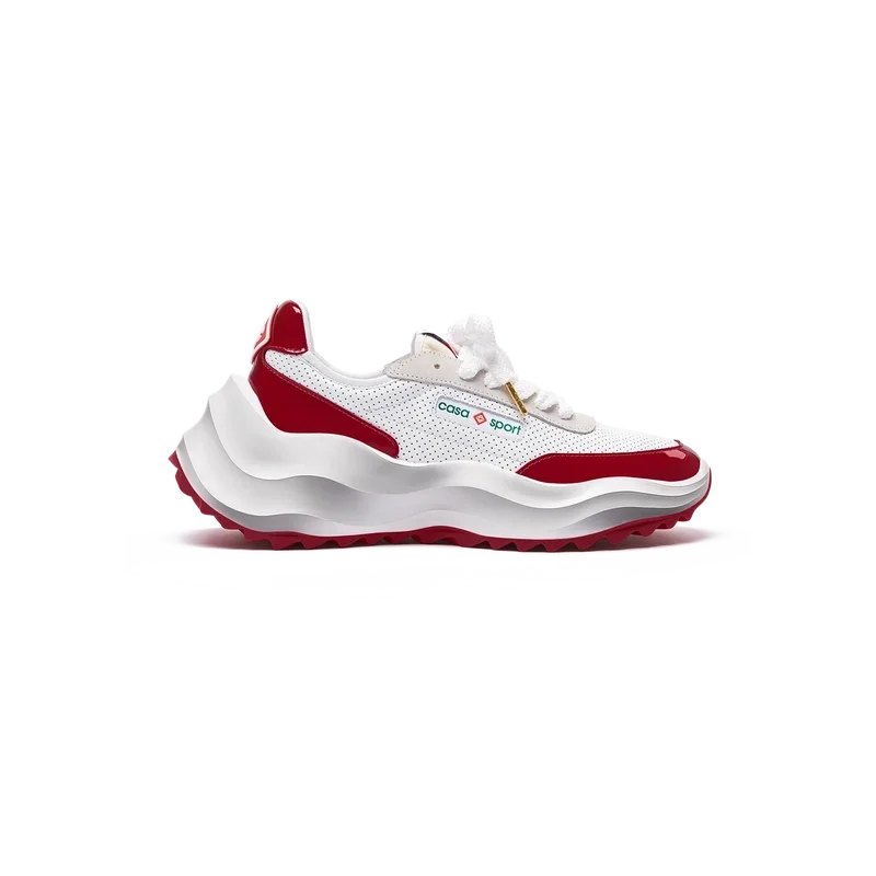 Överdrag i tonat Haute Red-lackläder, ovandel i perforerat läder, kontrasterande snörning i mocka, Casablanca-diamantmärke i gummi på hälfliken, vävd Casa Sport-etikett på sidan, vävd Atlantis-etikett på tungan, skulpterad EVA Wave-mellansula, yttersula i gummi, guldfärgade snörspetsar