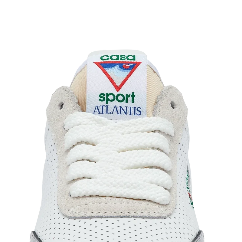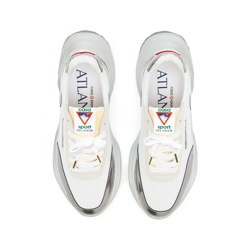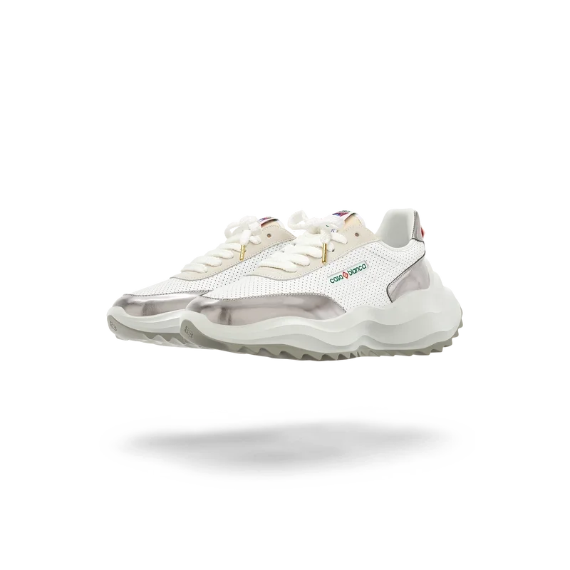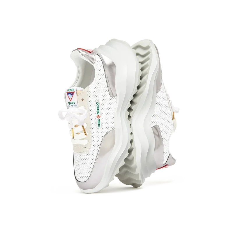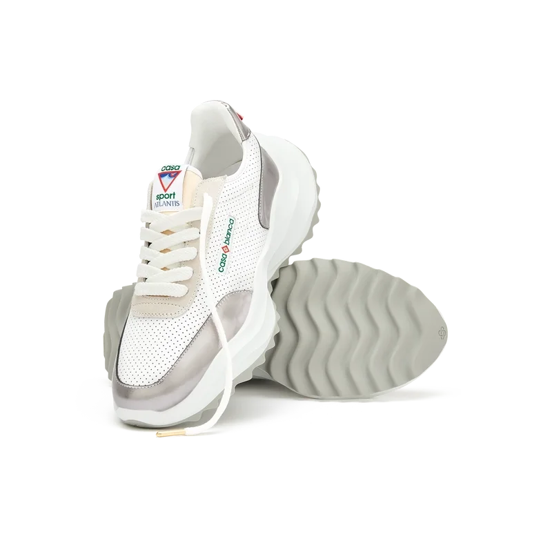 Överdrag i tonat kromlackerat läder, perforerad läderöverdel, kontrasterande snörning i mocka, Casablanca-diamantmärke i gummi på hälfliken, vävd Casa Sport-etikett på sidopanelen, vävd Atlantis-etikett på tungan, skulpterad EVA-vågformad mellansula, yttersula i gummi, guldfärgade snörspetsar