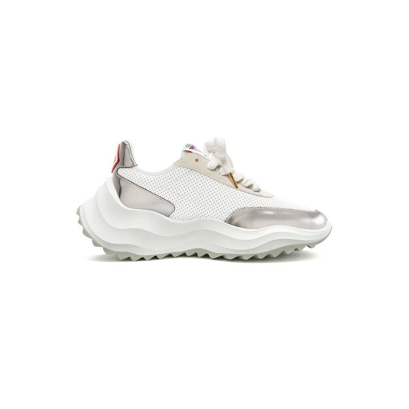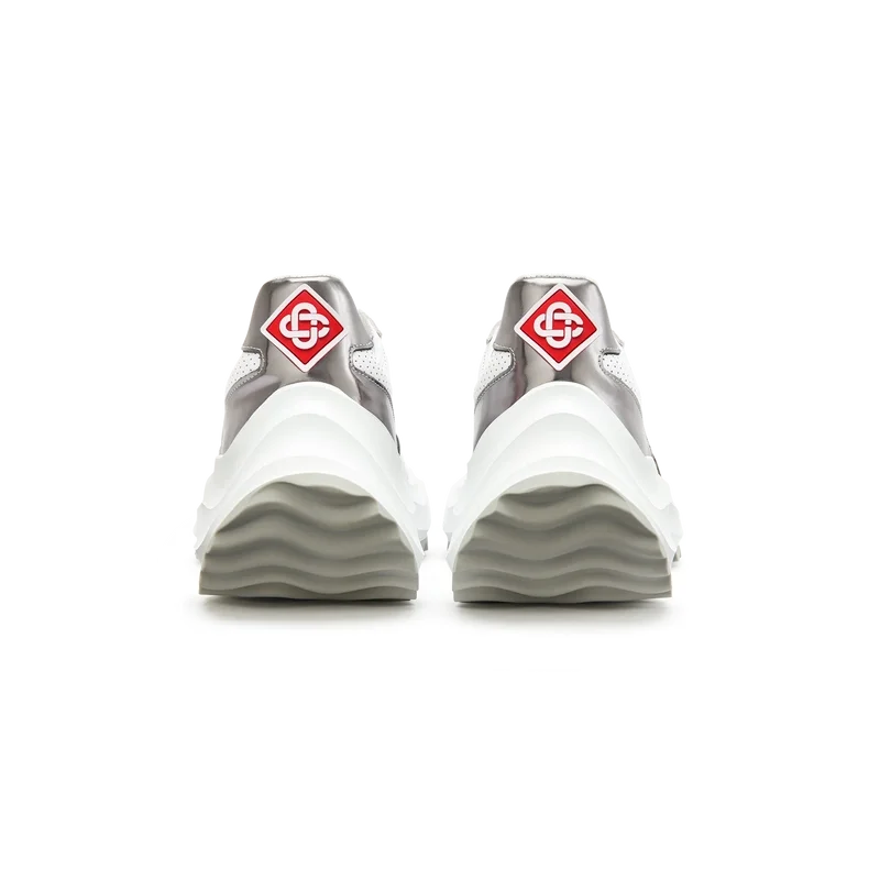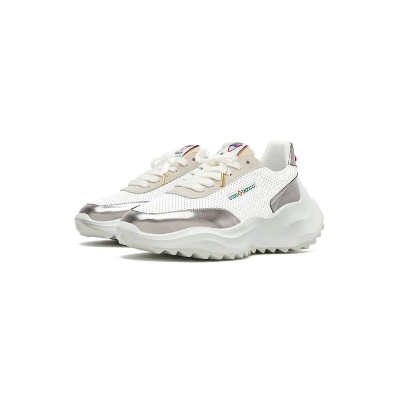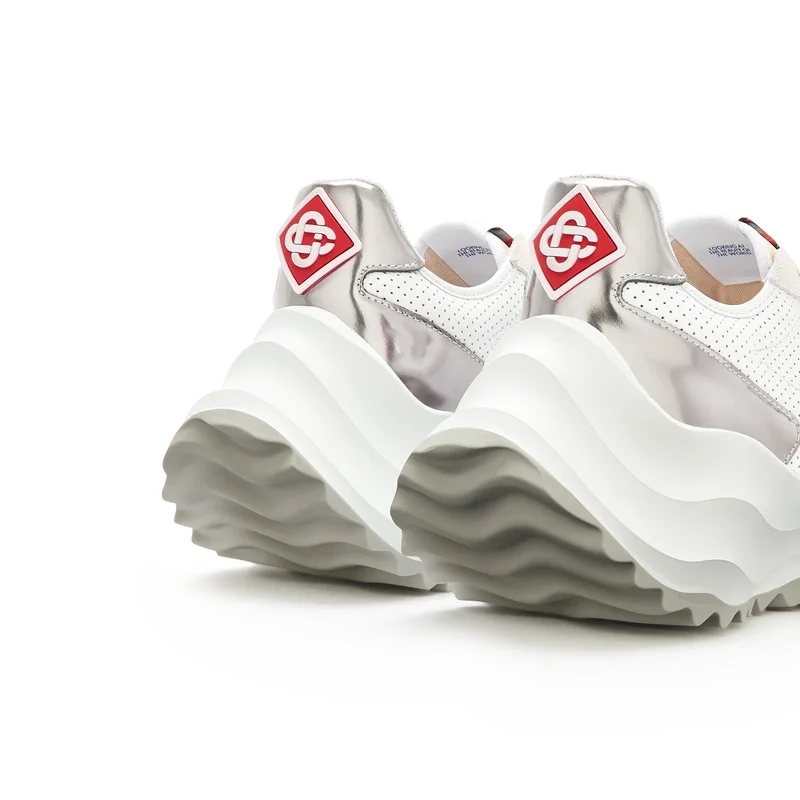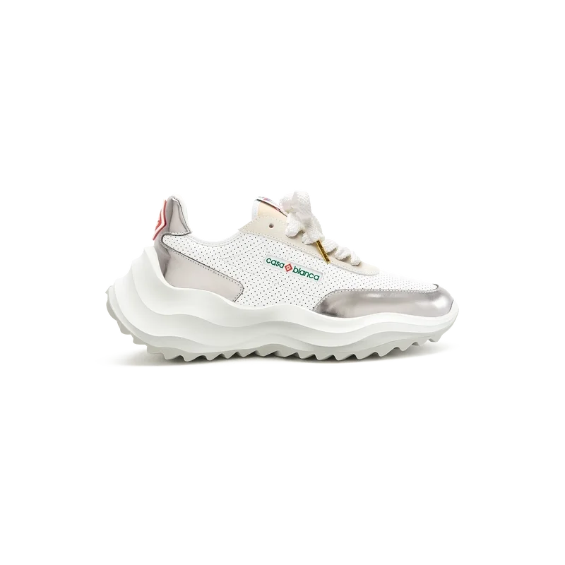 Överdrag i tonat kromlackerat läder, perforerad läderöverdel, kontrasterande snörning i mocka, Casablanca-diamantmärke i gummi på hälfliken, vävd Casa Sport-etikett på sidopanelen, vävd Atlantis-etikett på tungan, skulpterad EVA-vågformad mellansula, yttersula i gummi, guldfärgade snörspetsar