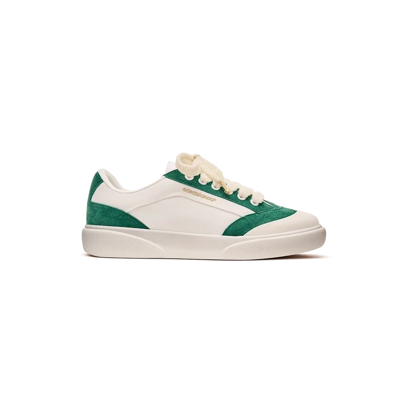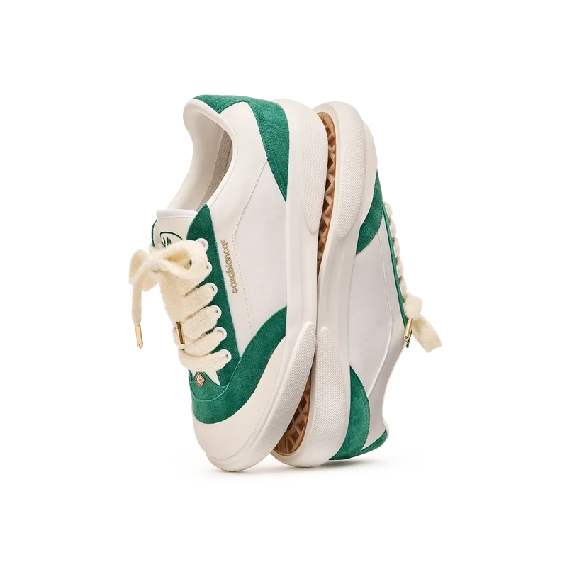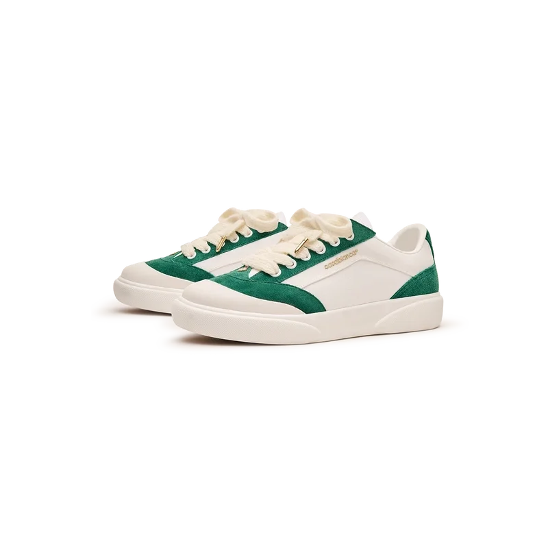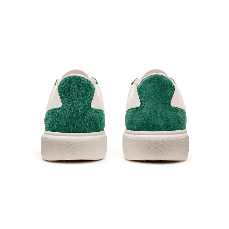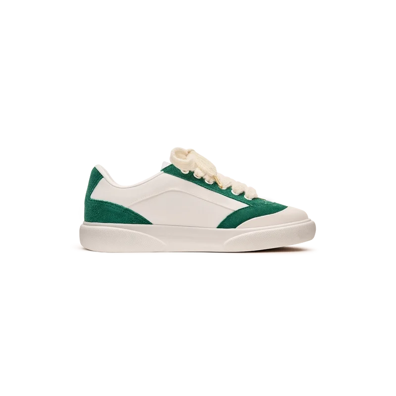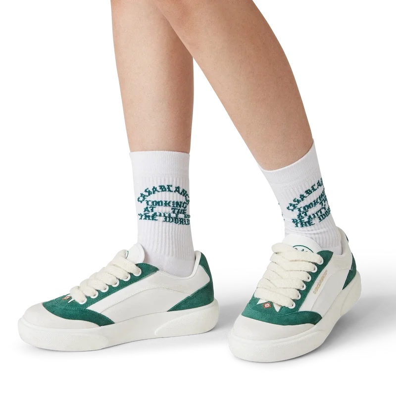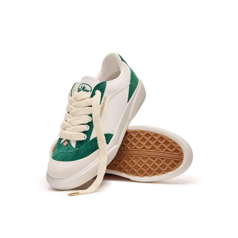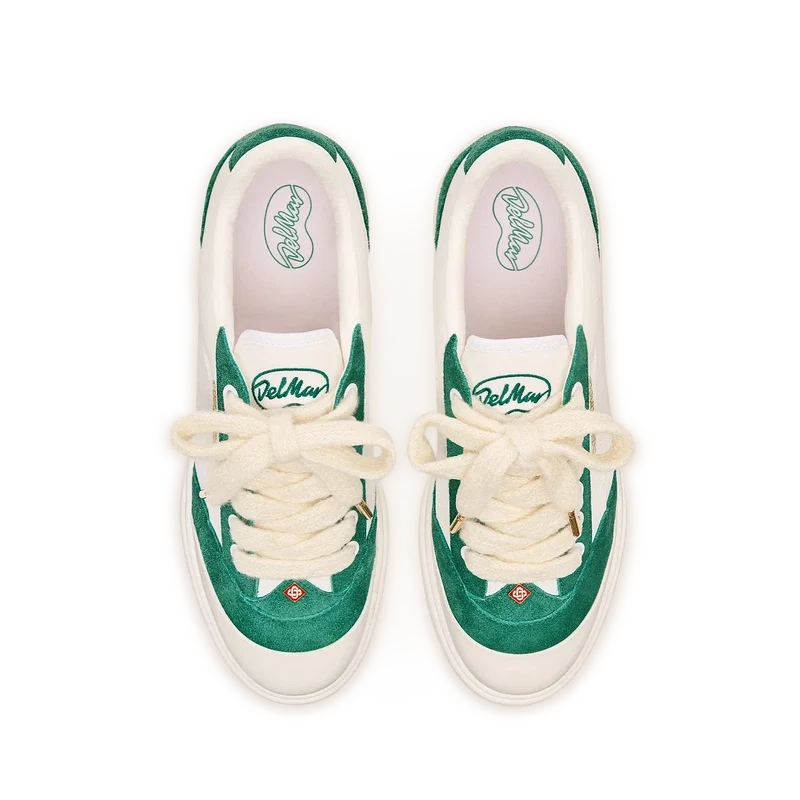 Damskorna Del Mar White and Green har fått sitt namn från den berömda skateparken i Kalifornien från 1980-talet. Del Mar-sneakersna är inspirerade av klassiska skateskor från slutet av 70-talet till början av 80-talet. De har många av de tidiga skateskornas kännetecken med ovandel i canvas, tåhätta i gummi, platt sula och tjocka snören, kontrasterande snörhål och diskret logotyp. Den gröna färgkombinationen är Casablancas klassiska varumärkesfärg.