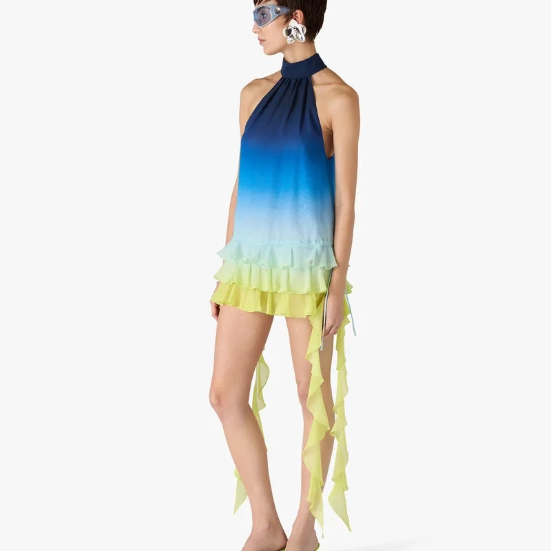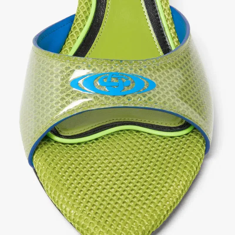 De gröna mulesandalarna med klack har en raffinerad design utan bakstycke och remmar med en elegant silhuett med öppen tå. De kompletteras med husets Warped-logotyp på ovansidan och en elegant låg klack som förkroppsligar husets sofistikerade syn på sommarskor.