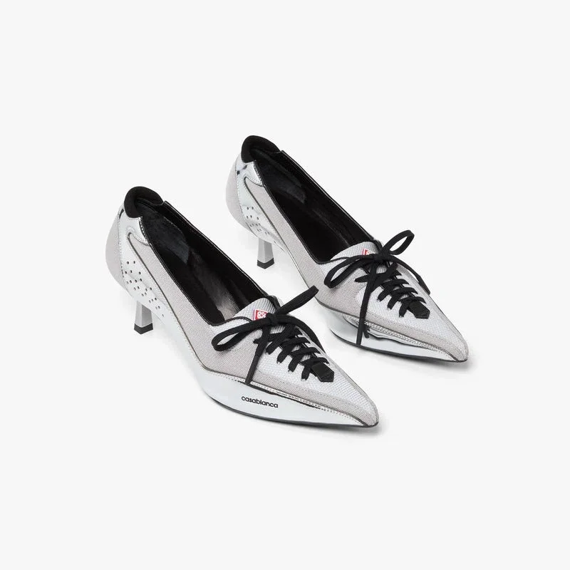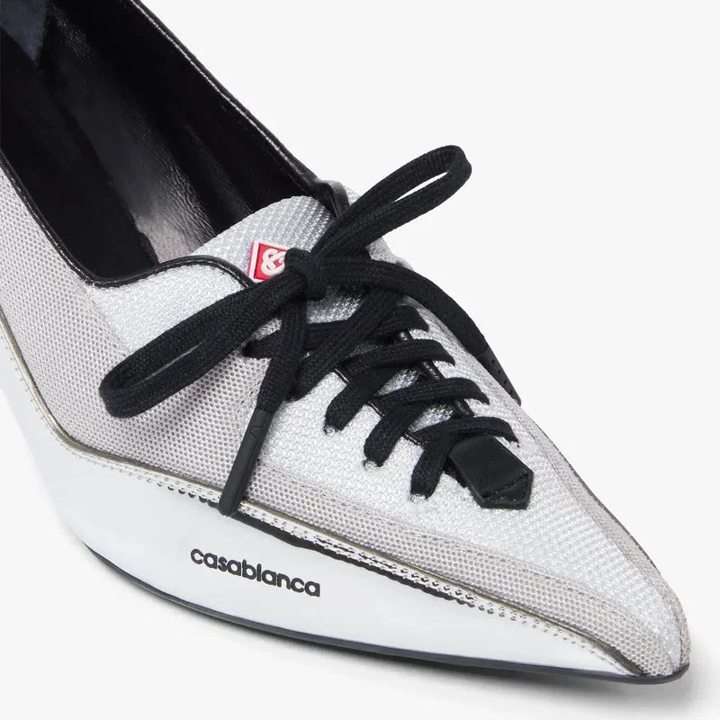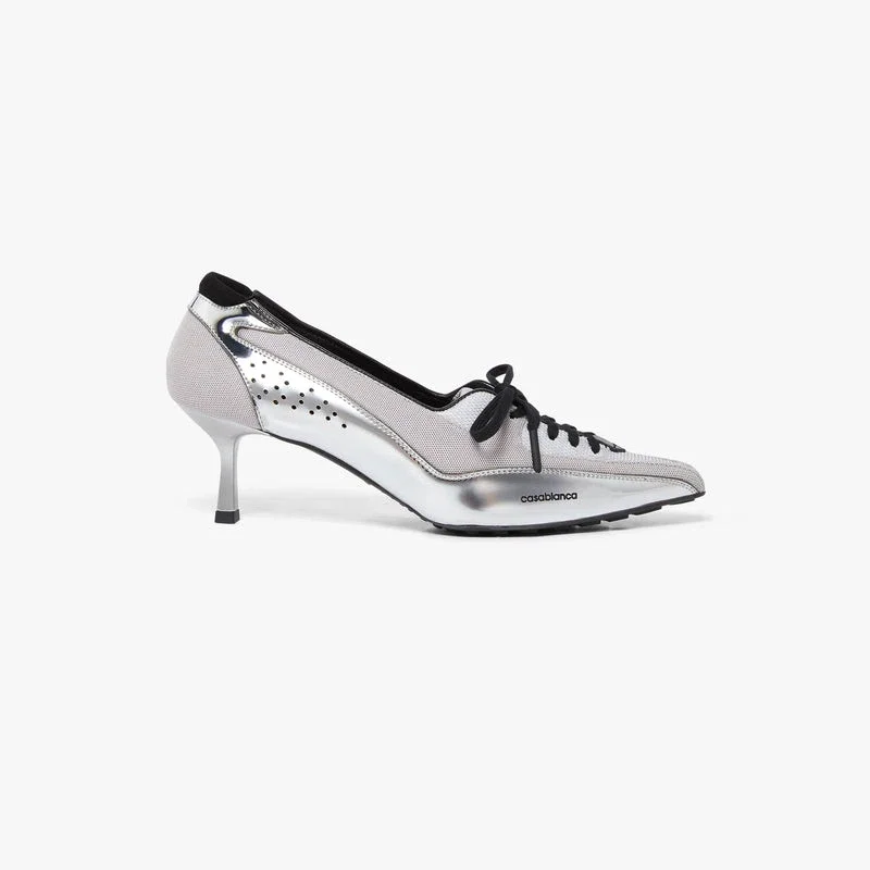 De silverfärgade läderpumpsen med klack har en raffinerad design och kännetecknas av en innovativ fusion av sneakers- och pumpssilhuetter. De är försedda med snörning, ovandel i läder och textil samt en elegant låg klack som förkroppsligar husets sofistikerade syn på samtida skor.
