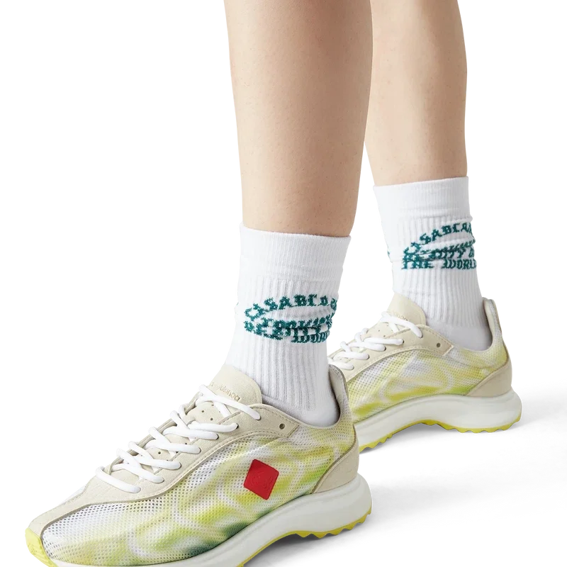 Dam-sneakersen Stade Green har fått sitt namn från det antika grekiska måttet för distansen i ett löpningslopp, vilket senare blev ordet för stadion. Stilen är inspirerad av prestationsinriktade löparskor och är en överföring av modern teknik från antik tradition, där koden för modernt löpande med lättviktigt mesh och glödande tryck bidrar till moderniteten. Sulan har skulpterade kurvor, vilket är en referens till vår Atlantis-sko och ett stabilt inslag i Casablanca-designen.