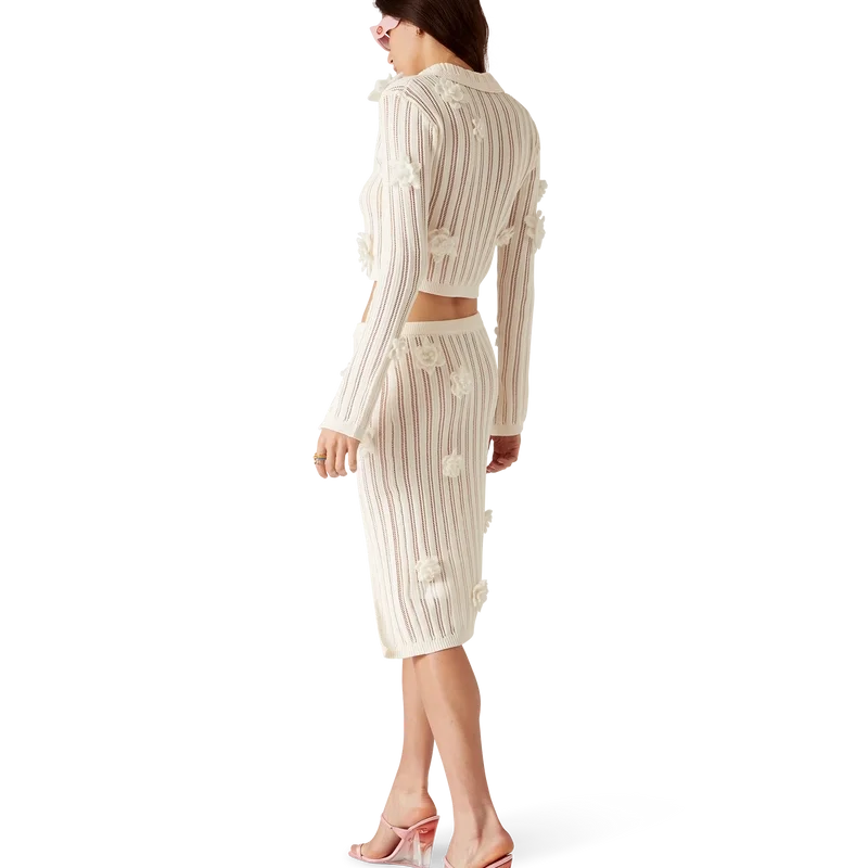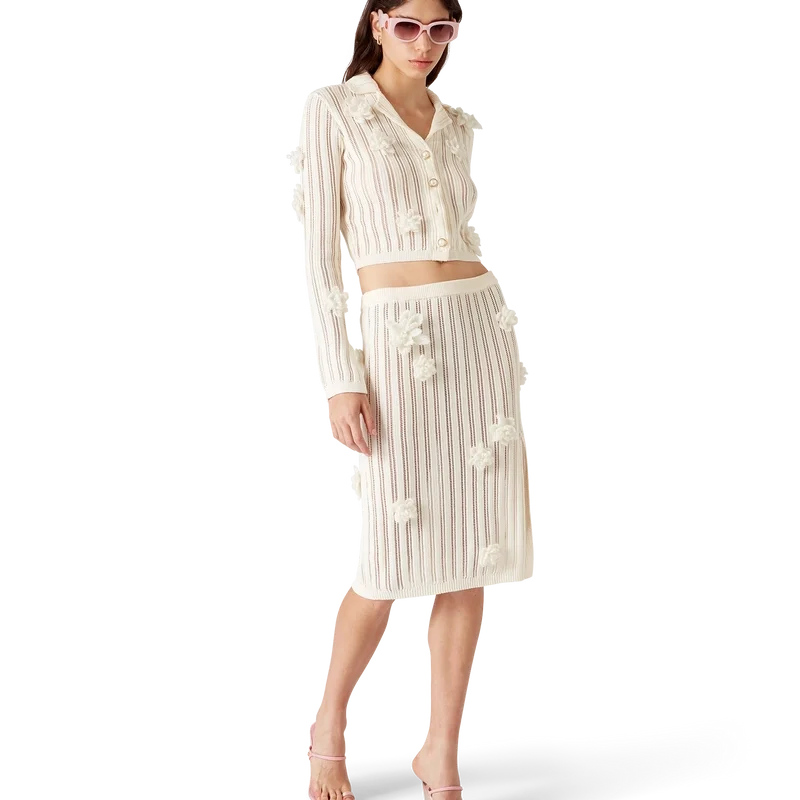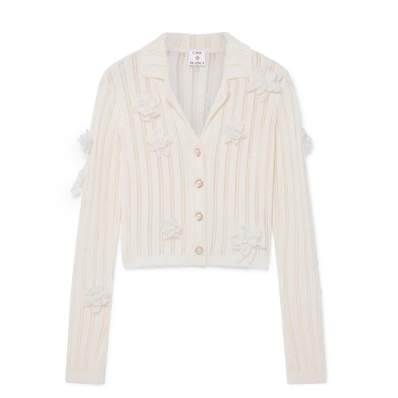Blommig spetsstickad skjorta är en långärmad modell tillverkad av spetsstickat bomullstyg. Försedd med klockärmar med slitsdetalj, krage, knäppning, signaturknappar med guldkant och pärlor samt applikationer med blommotiv.