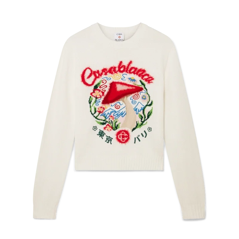 Den broderade tröjan i bomull med svampmotiv är en långärmad modell med ett av husets signaturdesignelement – svampen – tillverkad i bomullstyg. Avslutas med en klassisk rund hals, ribbade muddar och nederkant.