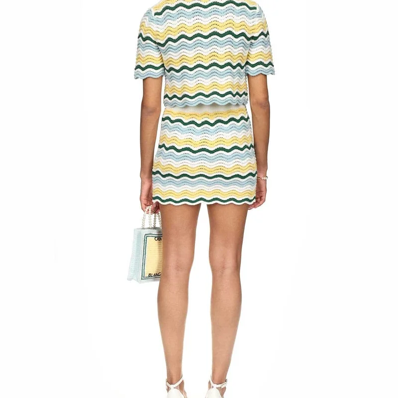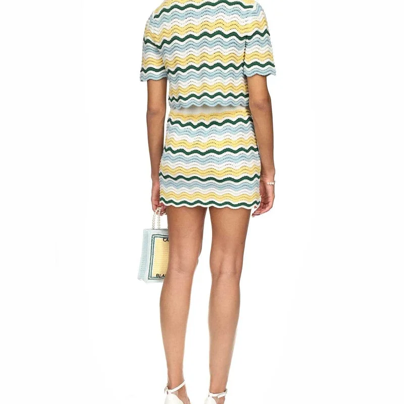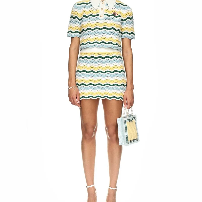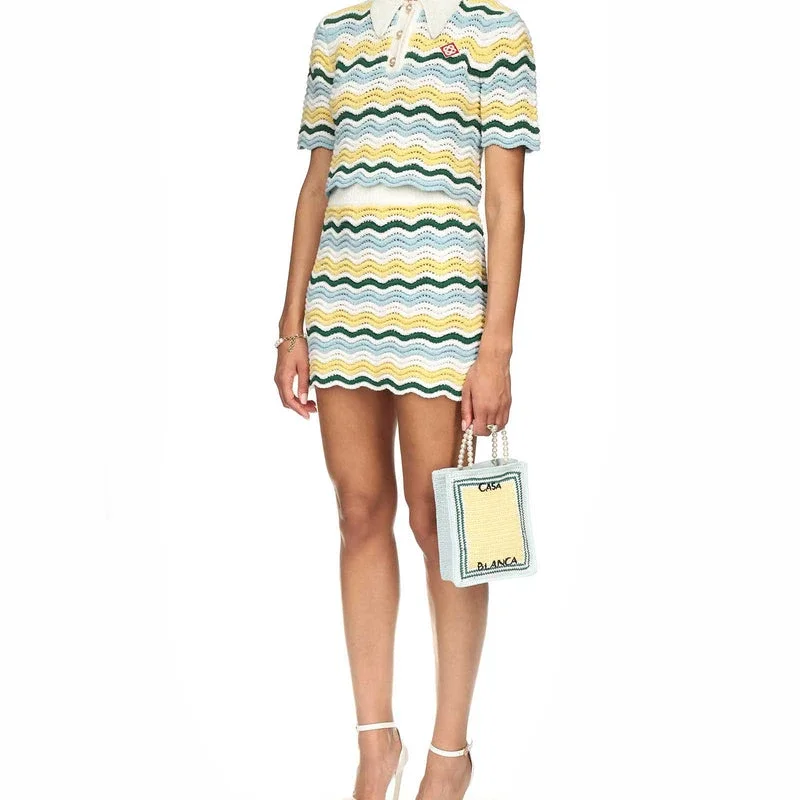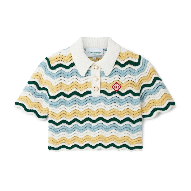 Boucle Wave Top är en kortärmad signaturmodell i Casablanca-stil, tillverkad av ett mjukt, texturerat virkat tyg med öppen vävning och har en vit ribbad krage och knäppning. Den bomulls- och nylonblandade stickade tröjan är försedd med husets diamantlogo och Casablanca Paris-märkesetikett och är designad för att ha en smal passform.