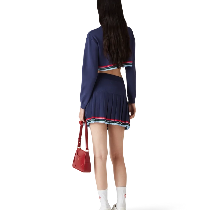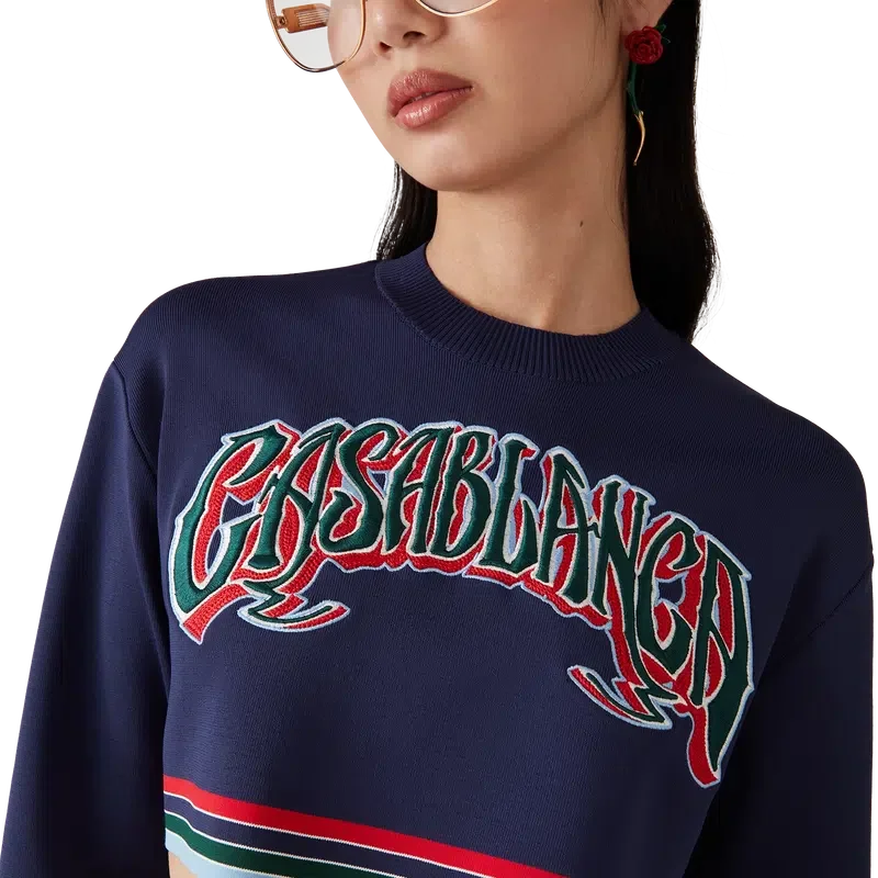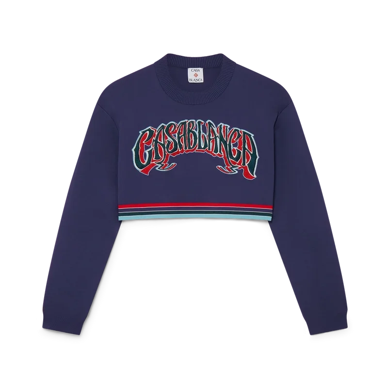 Den korta baseballtröjan är tillverkad av trikå och har broderad handritad typografi av Casablanca-logotypen, inspirerad av den gotiska typsnittet som används i tatueringar. Kompletterad med ribbad krage och muddar samt en detalj med horisontella ränder i rött, vitt, blått, grönt och marinblått i nederkanten.
