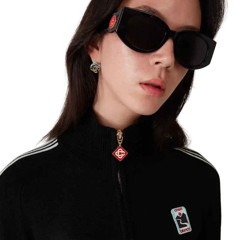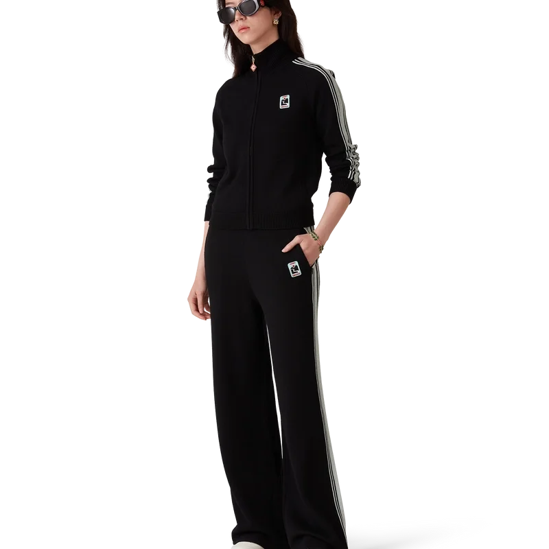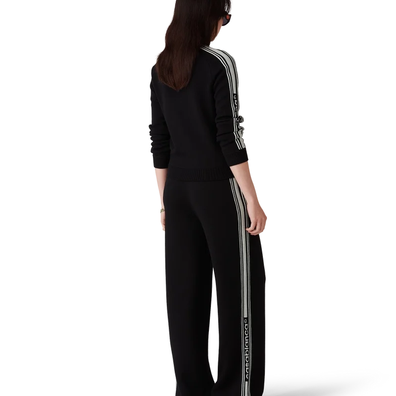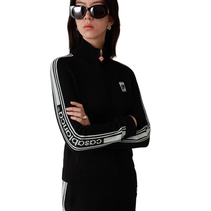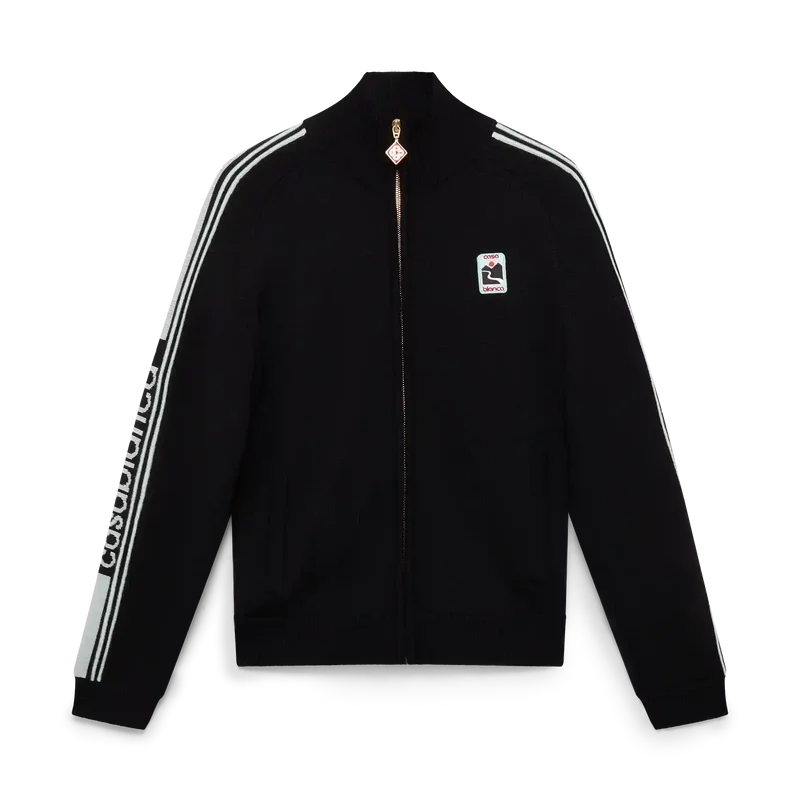 Merino Knit Track Jacket är en långärmad stickad jacka tillverkad av merinoull. Den har ribbade detaljer vid ärmslut och nederkant, en kontrastknäppning, en trattkrage, dragkedja fram, randiga detaljer längs ärmarna och Casablanca-logotypen.