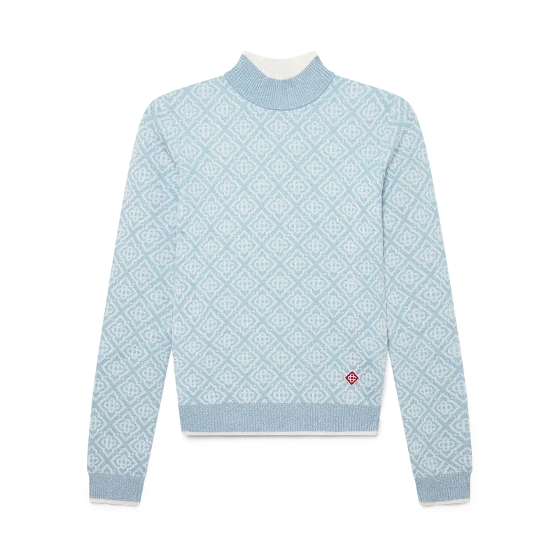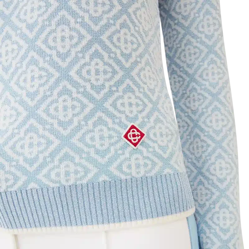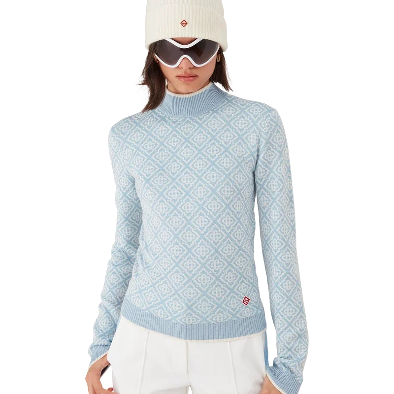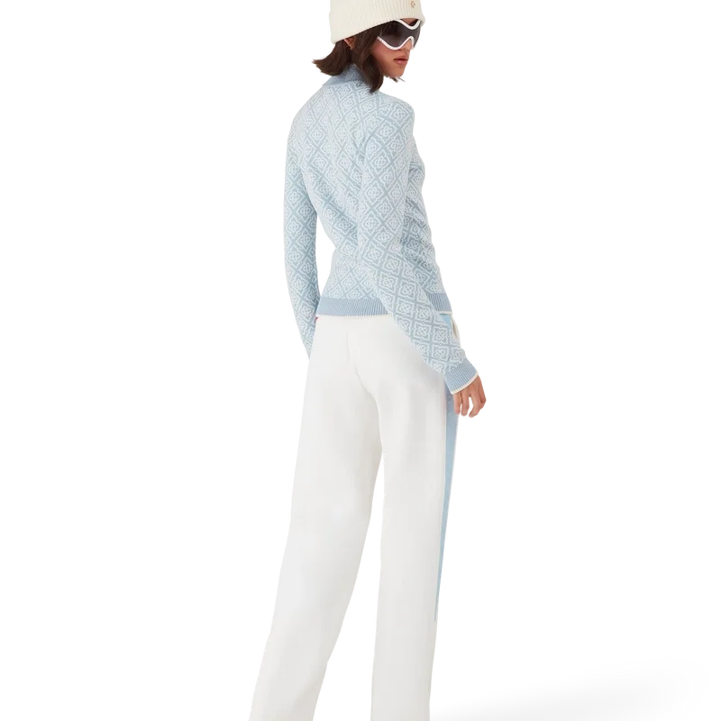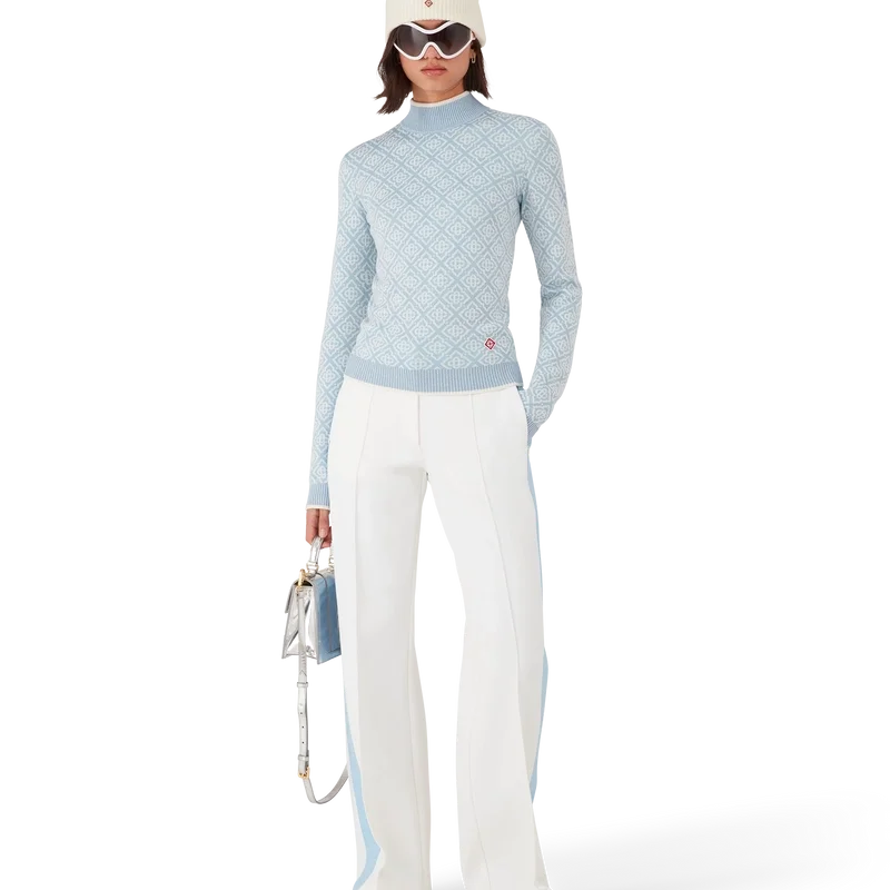 Ski Monogram High Neck Top är en raffinerad Apras-Sport-design tillverkad av merinoullstyg, med husets distinkta blå och vita monogrammotiv inspirerat av traditionella japanska vintermönster. Designen hämtar inspiration från den intrikata skönheten hos frostkristaller på tempelfönster och den rytmiska geometrin hos snötäckta staket på landsbygden.