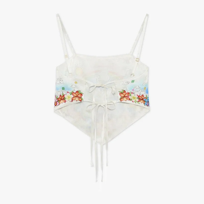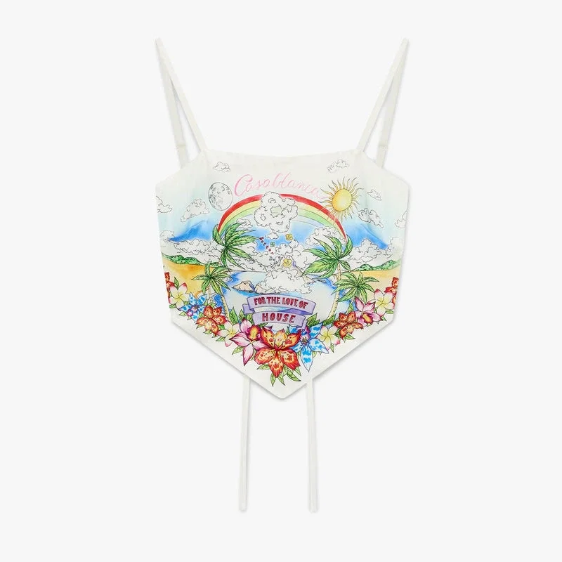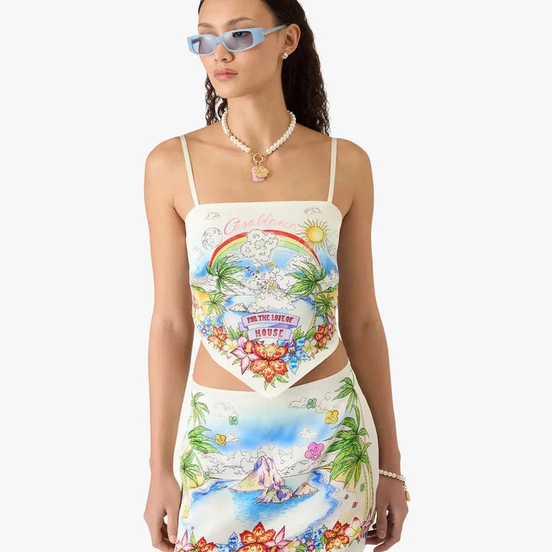 Better Days Silk Satin Scarf Top är en raffinerad design med säsongens Better Days-konstverk som beskriver den utopiska visionen av Ibiza som en destination för en nästan religiös pilgrimsfärd av upptäckter genom dess mångsidiga musiklandskap. Kompletterad med spaghettiband, knytning bak och en smal silhuett. Designad för att bäras med den matchande minikjolen.
